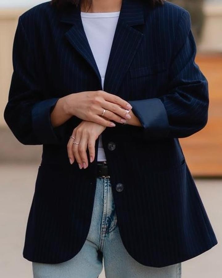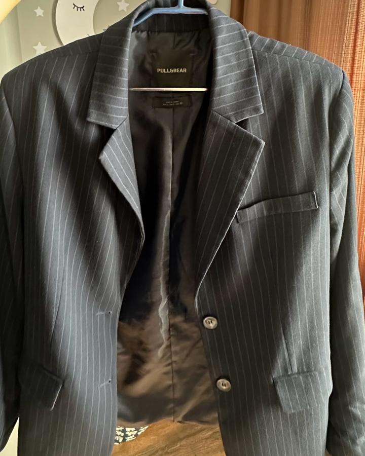 пиджак темно-синяя в полоску Pull&Bear, размер L не прижилась в гардеробе, в носке пару раз состояние отличное состав: полиэстер, вискоза и эластан Артикул: 575356