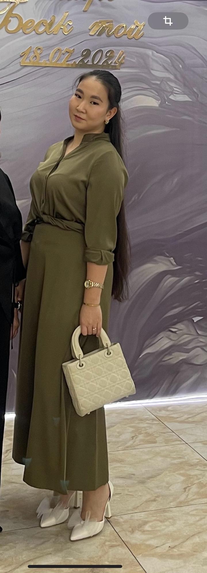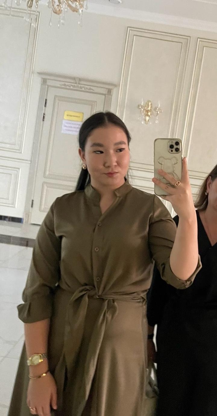 Двойка атласная, одевала 1 раз, размер 48, юбка на резинке, длина по щиколотку(на рост 165-166), пятен нет, блузка пуговицы+ завязка. Брала за 20000, цвет хакки Артикул: 575396