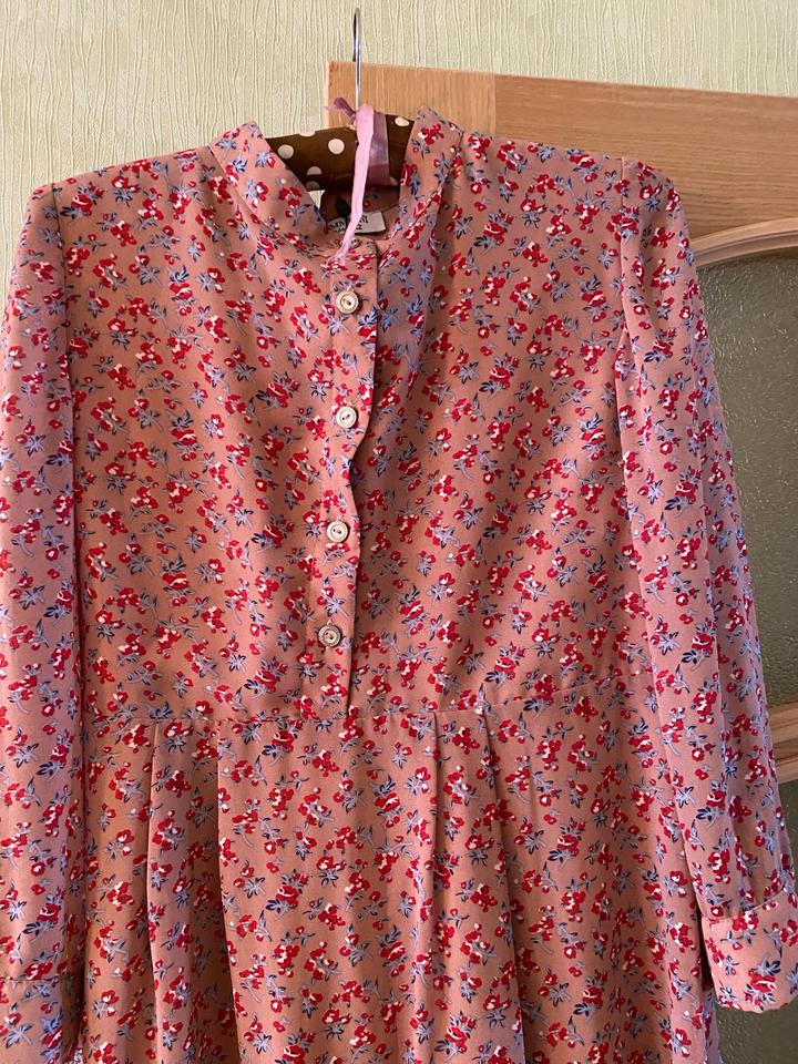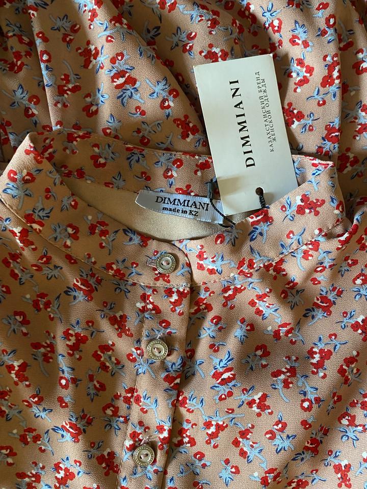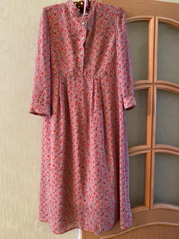 новое платье, креп-шифон, коралловое в красно-голубые цветочки, свободное, 42размер. Пуговицы рабочие. Казахстанского бренда. Имеется подклад. Артикул: 575947