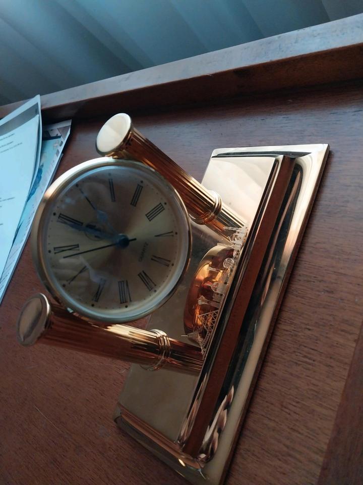 Характеристики В комплекте: 1 шт Вес: 1,5 кг Индикация: Часы Источник питания: Батарейки Материал: Латунь Покрытие: Золото 23 карат, медь, никель Размер: 21,9 см х 9,5 см х 13 см. Страна производитель товара: Испания Тип механизма: Кварцевые Тип циферблата: Аналоговый (стрелочный) Артикул: 576119