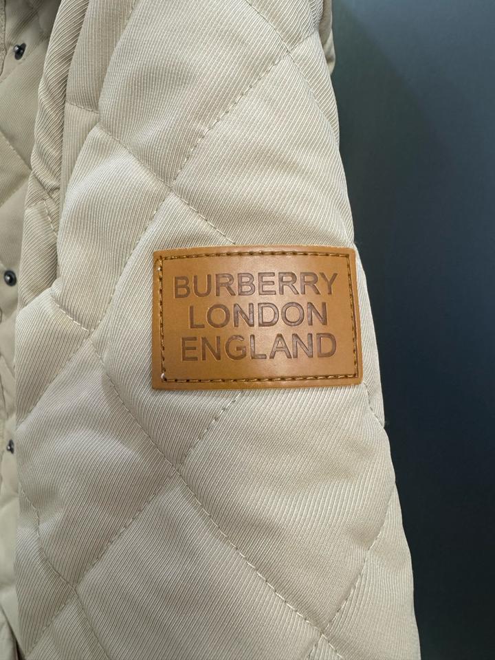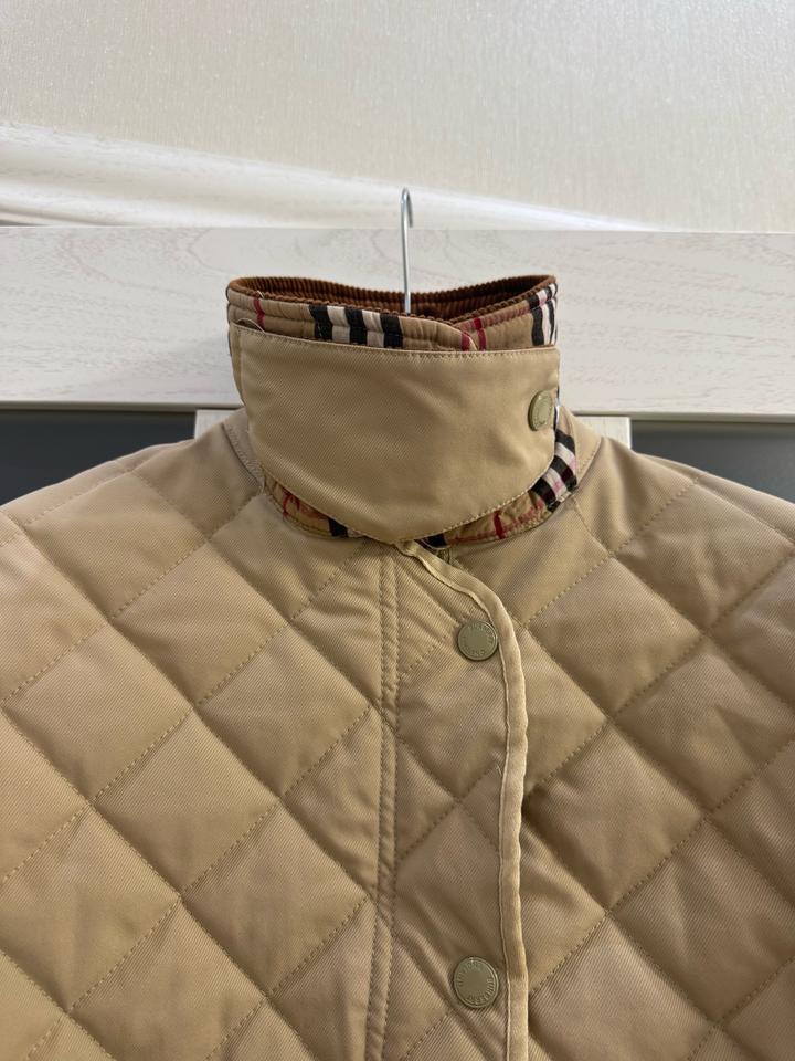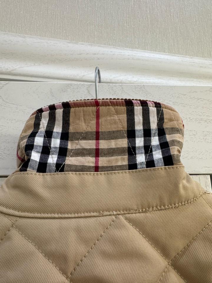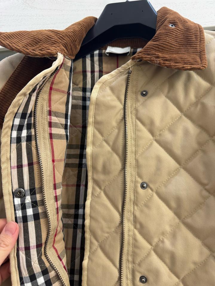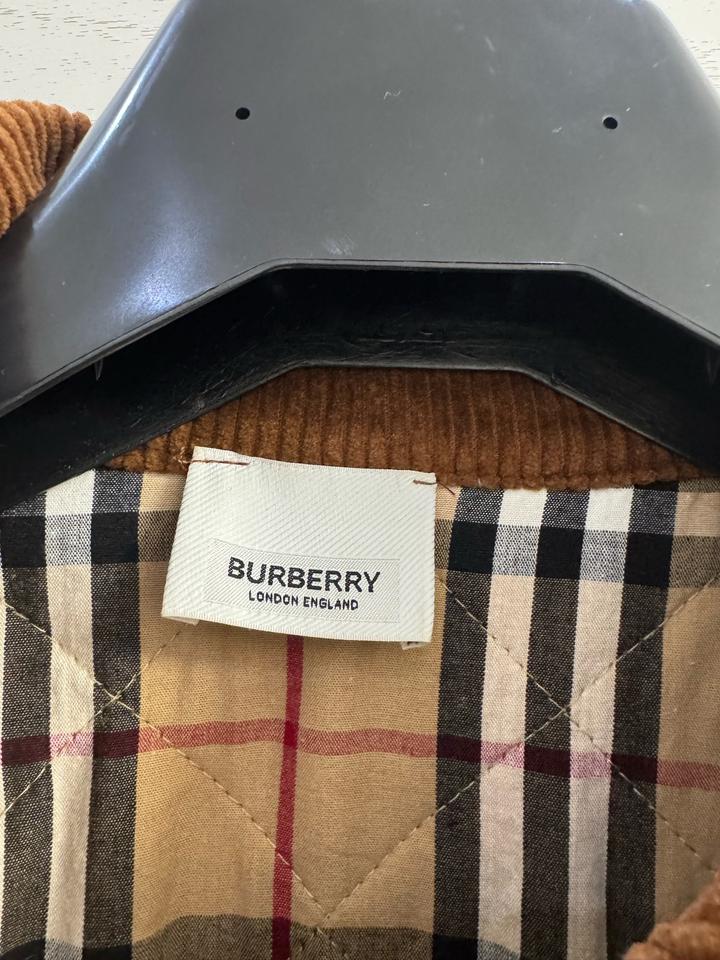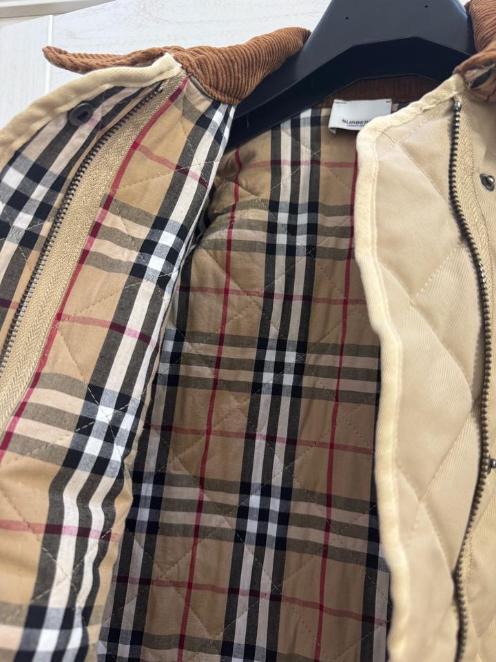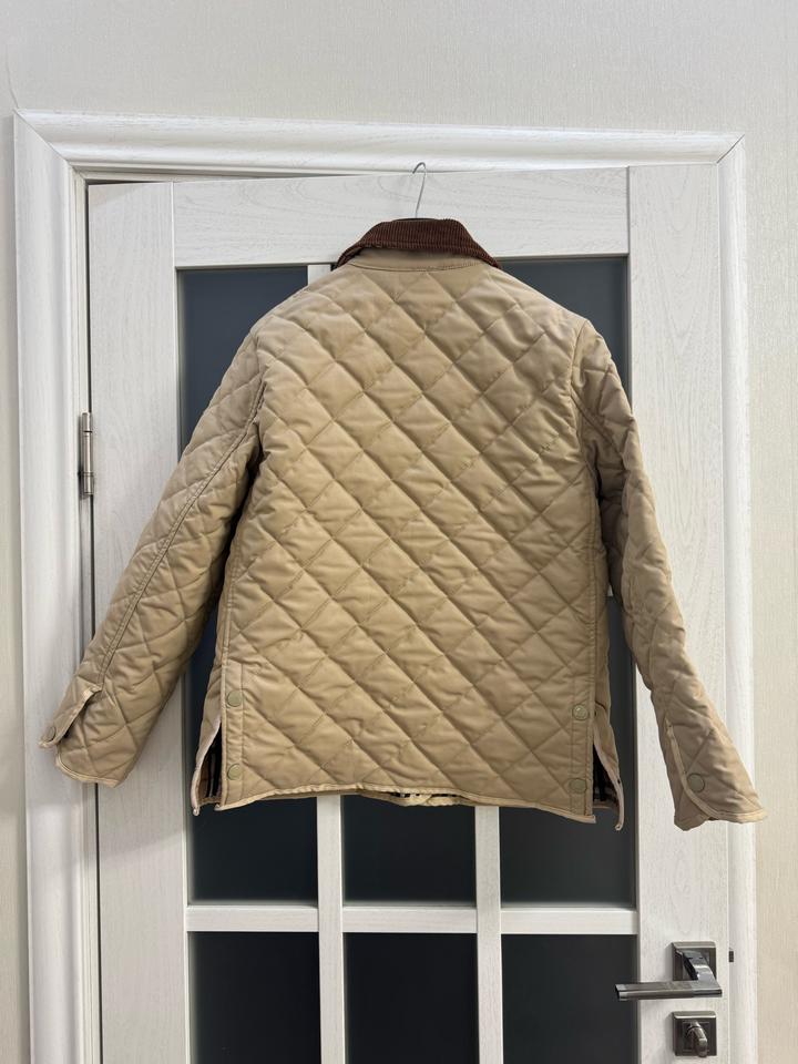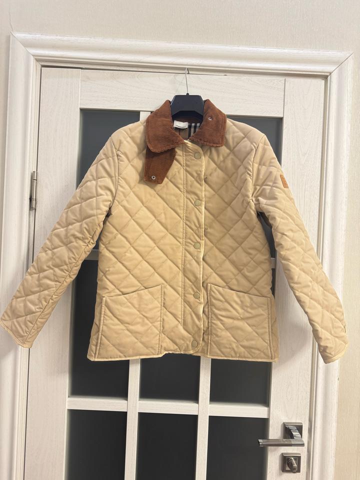 Бежевая стеганая куртка Burberry с коричневым вельветовым воротником с передней панелью и клетчатой облицовкой House, двойной молнией спереди, планкой на кнопках, двумя передними накладными карманами, боковыми вентиляционными отверстиями на кнопках, кожаной вкладкой с логотипом на левой руке, манжетами на кнопках и внутренней частью House check. Мягкий и с подкладкой. Размер L, маломерит больше на М,S Артикул: 576247