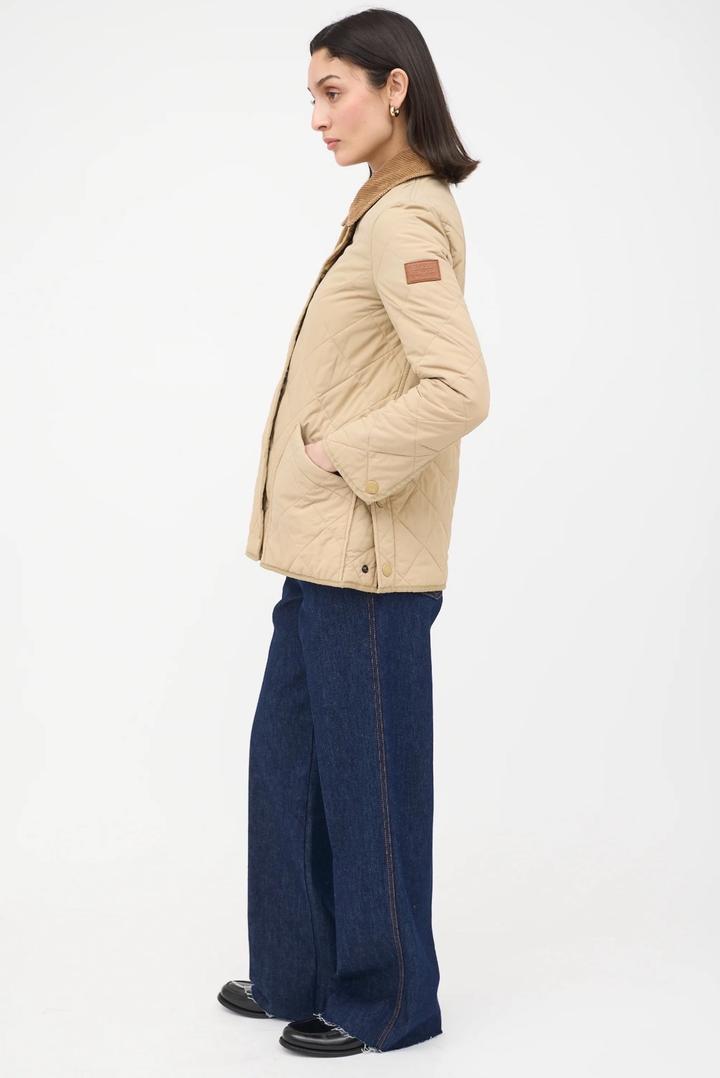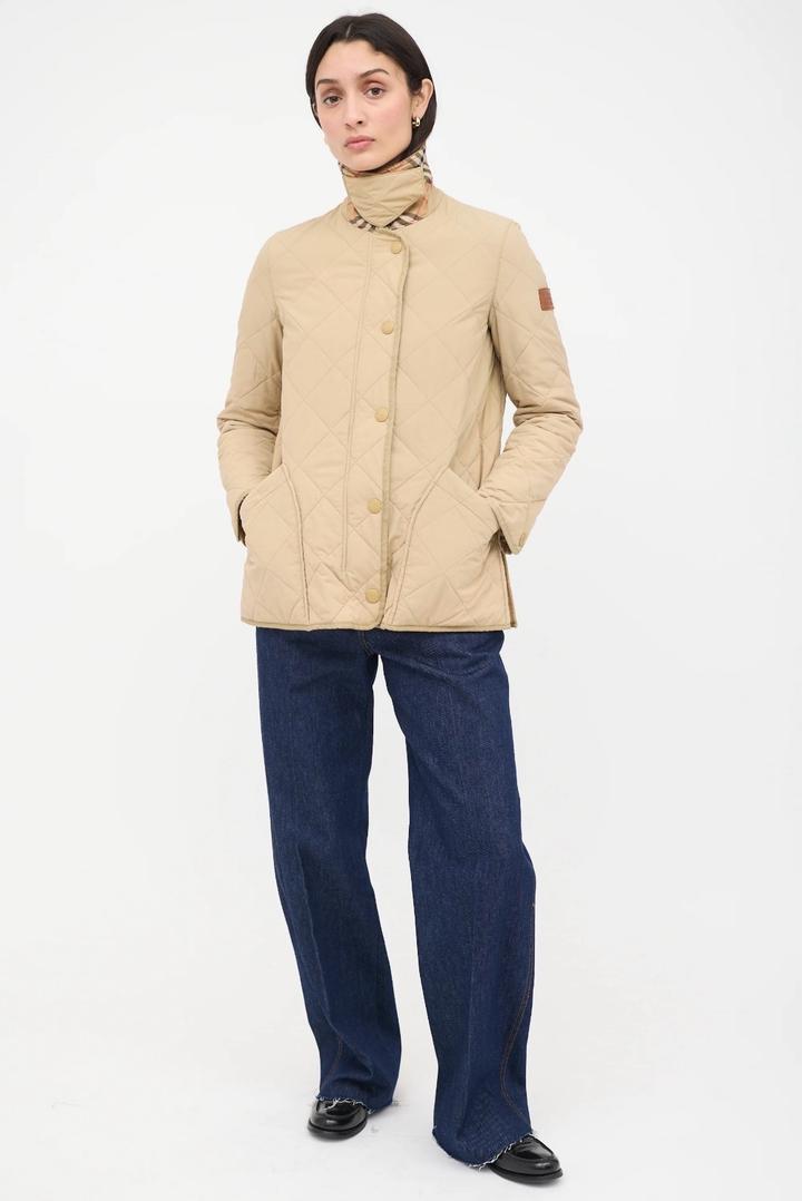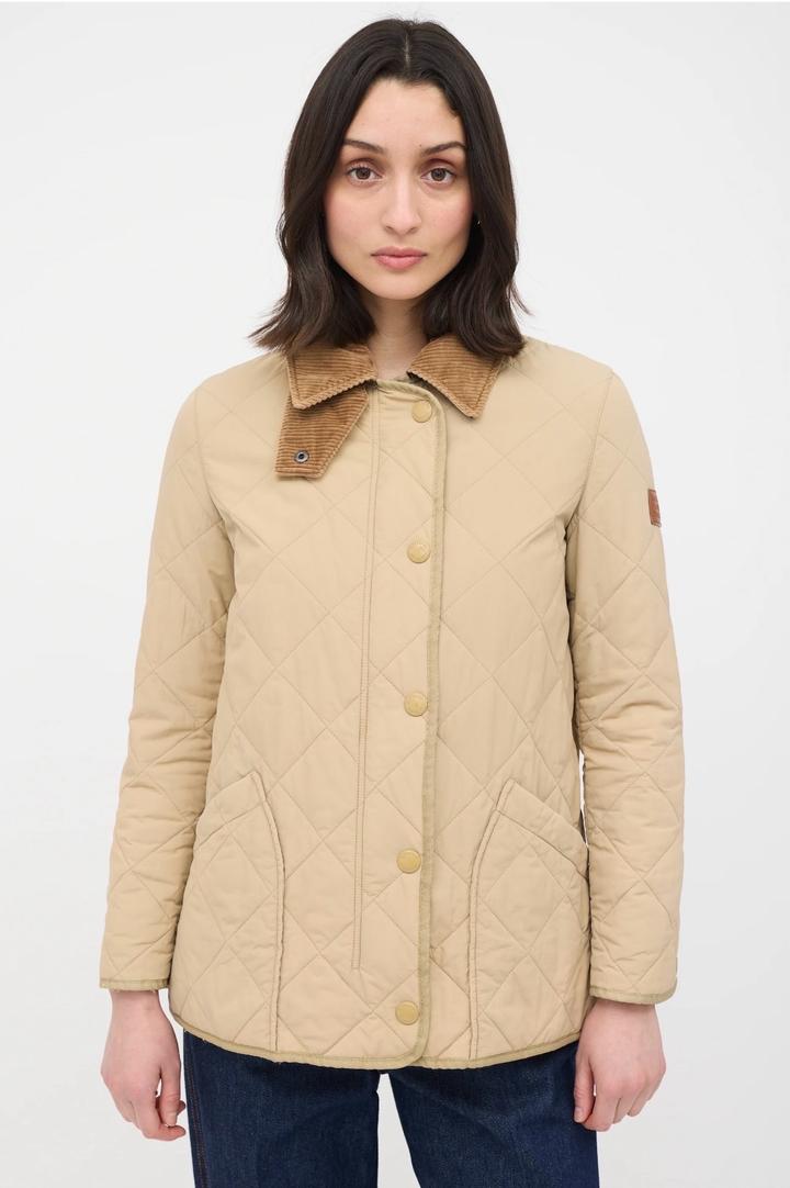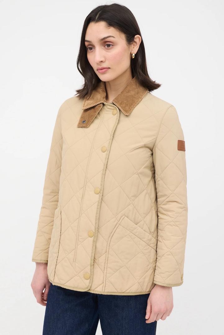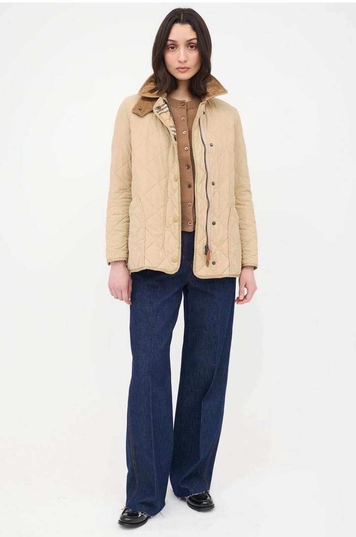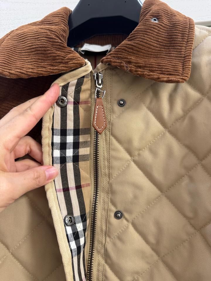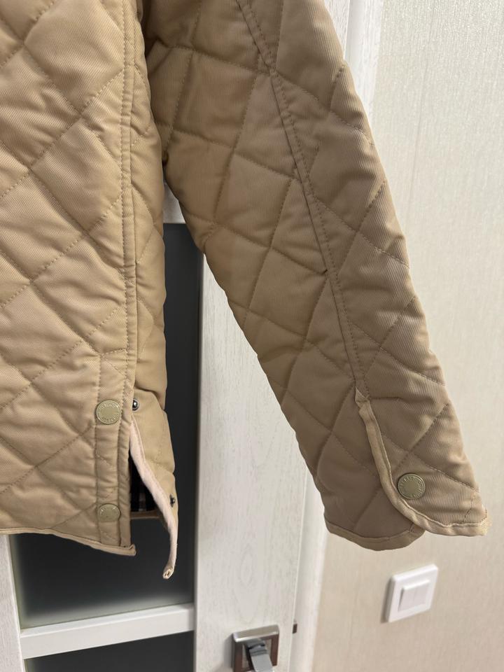 Бежевая стеганая куртка Burberry с коричневым вельветовым воротником с передней панелью и клетчатой облицовкой House, двойной молнией спереди, планкой на кнопках, двумя передними накладными карманами, боковыми вентиляционными отверстиями на кнопках, кожаной вкладкой с логотипом на левой руке, манжетами на кнопках и внутренней частью House check. Мягкий и с подкладкой. Размер L, маломерит больше на М,S Артикул: 576247