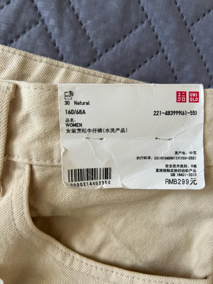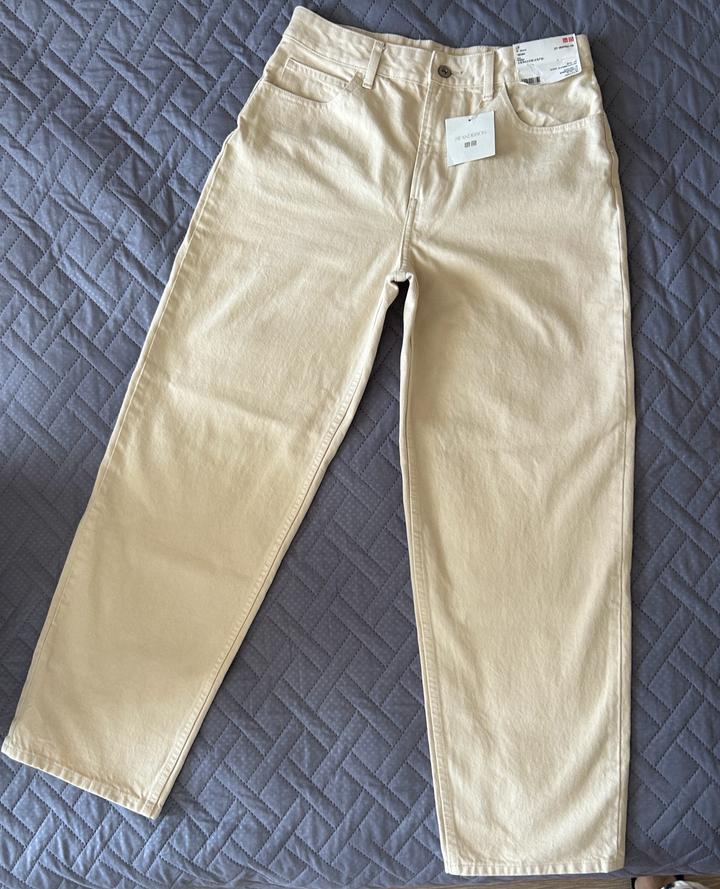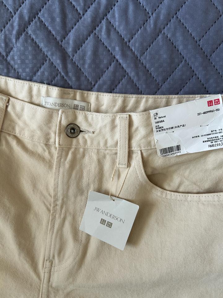 Абсолютно новые, только примерила не подошел размер. Подойдет больше на L. Цвет молочный. Прямые джинсы. Сидят идеально. Крой очень хороший у этой коллаборации с дизайнером JW ANDERSON. Прикрепила таблицу размеров с сайта, может будет полезно. Артикул: 576299