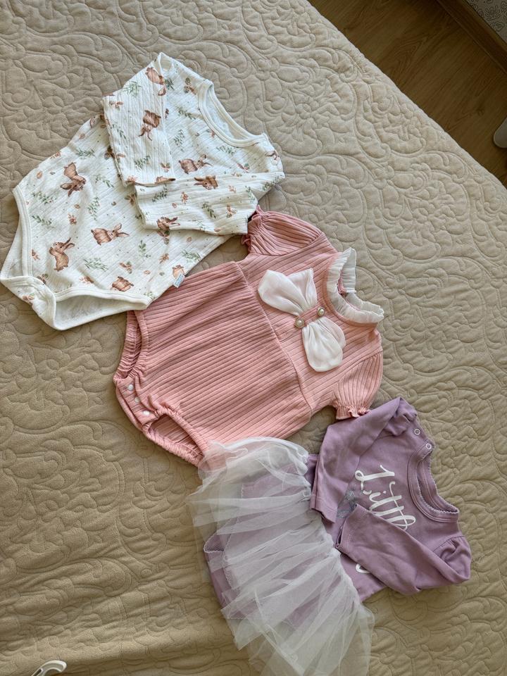Нарядные бодики в светлых тонах, очень хорошего качества, в идеальном состоянии. На весну и лето отличный вариант, готовые луки. Размер 80, с зайчиками 90 Артикул: 576301