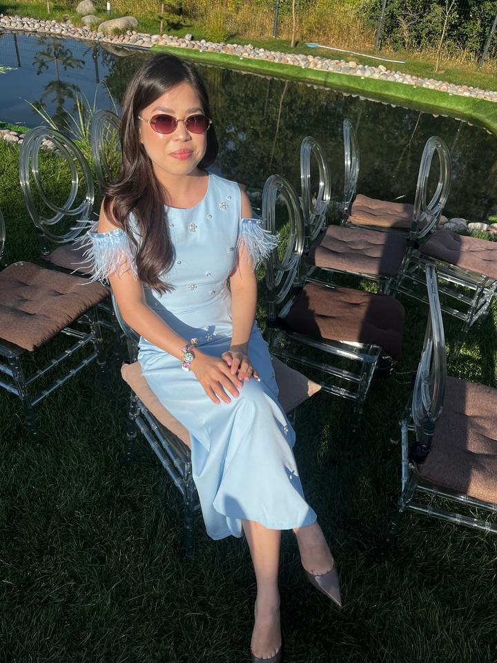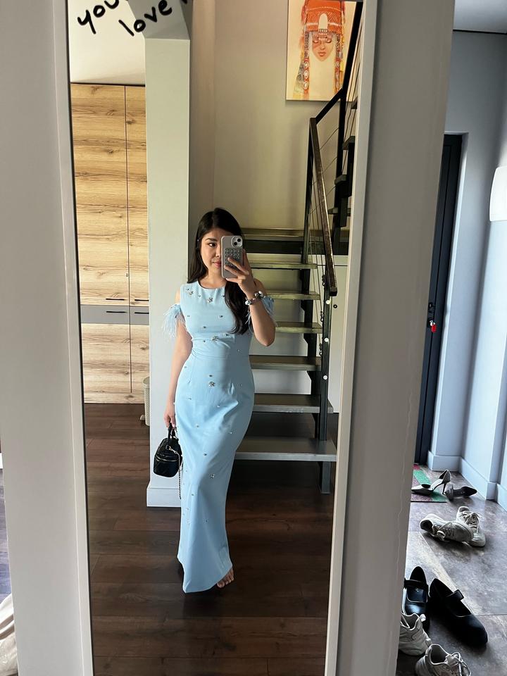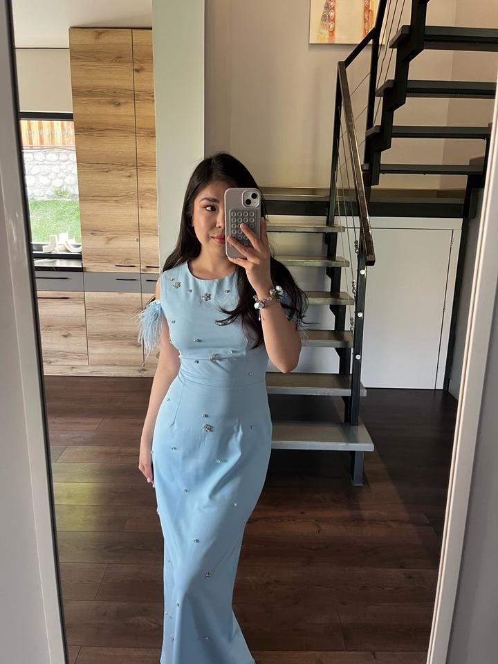 Очень красивое, нежное платье голубого цвета с перьямиXS