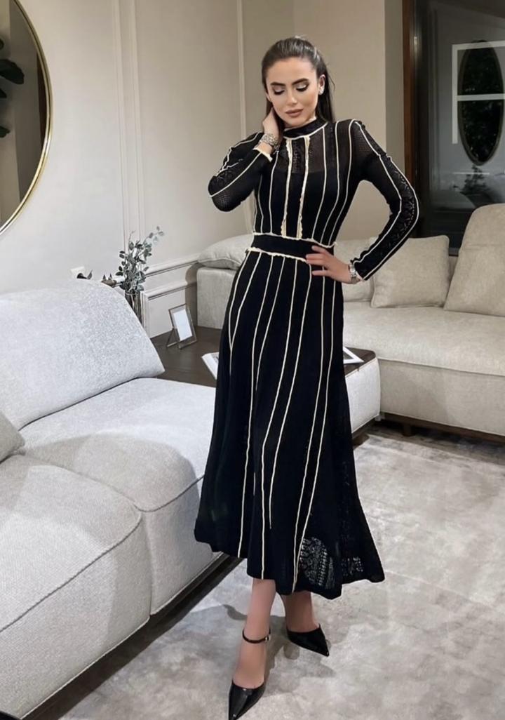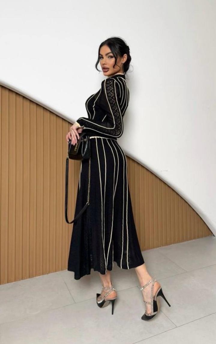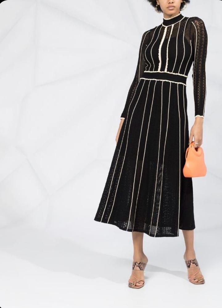 Платье Sandro (оригинал) Стильное и элегантное платье в черном цвете с контрастными беживыми полосками. Приталенный силуэт красиво подчеркивает фигуру, а расклешённая юбка добавляет женственности и лёгкости образу. Верх с длинным рукавом и аккуратной стойкой, материал слегка фактурный — смотрится дорого и эффектно. Подойдёт как для повседневных образов, так и на выход. Артикул: 576375