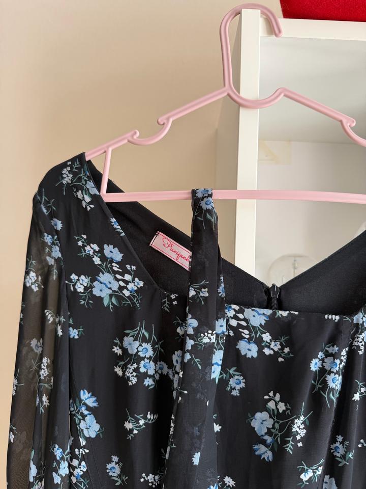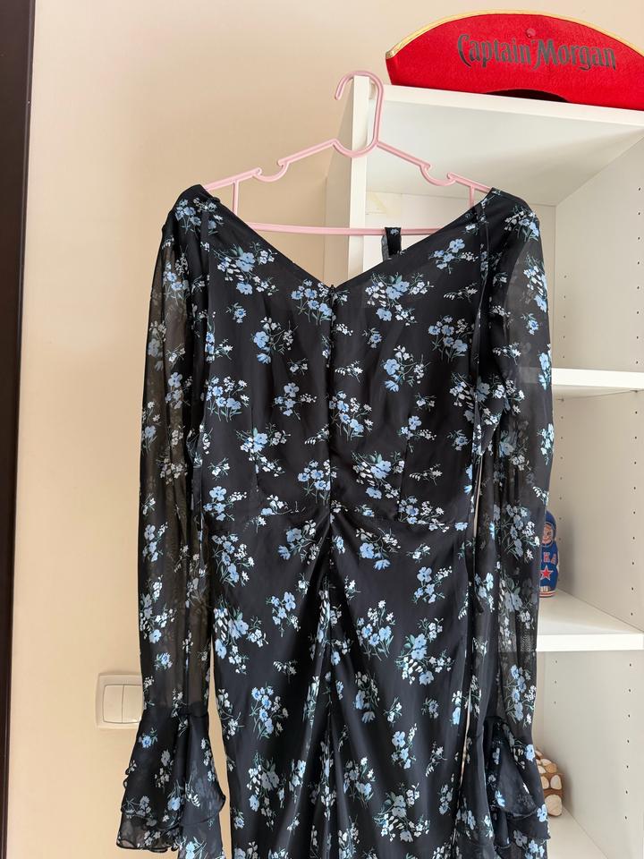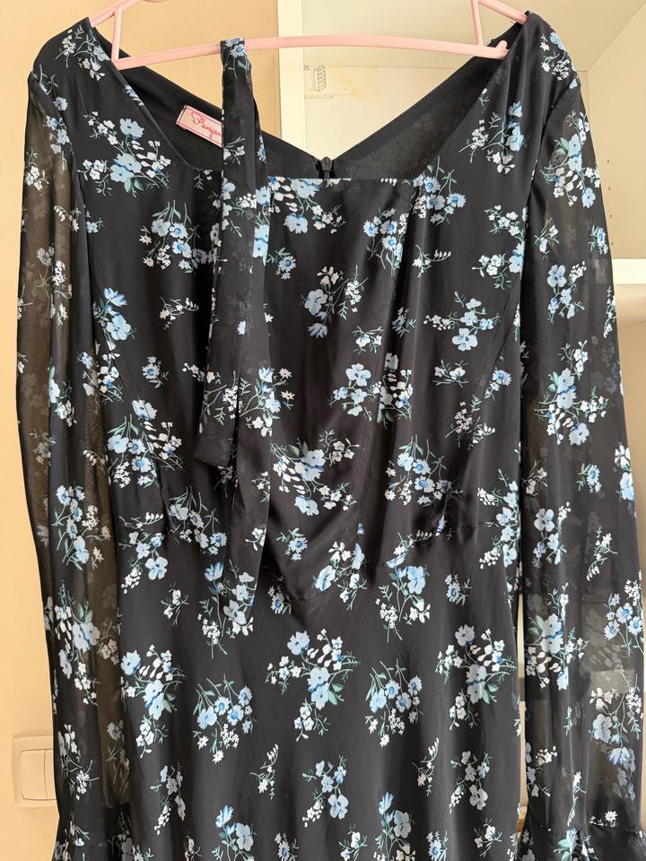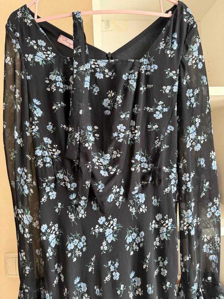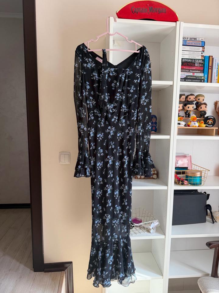 Нежное длинное платье с цветочным принтом. Легкая струящаяся ткань, красиво сидит по фигуре. Рукава с легкой сборкой, низ с воланом. Надевалось 1 раз. Длина макси. Есть еще чокер на шею к нему. Артикул: 576537