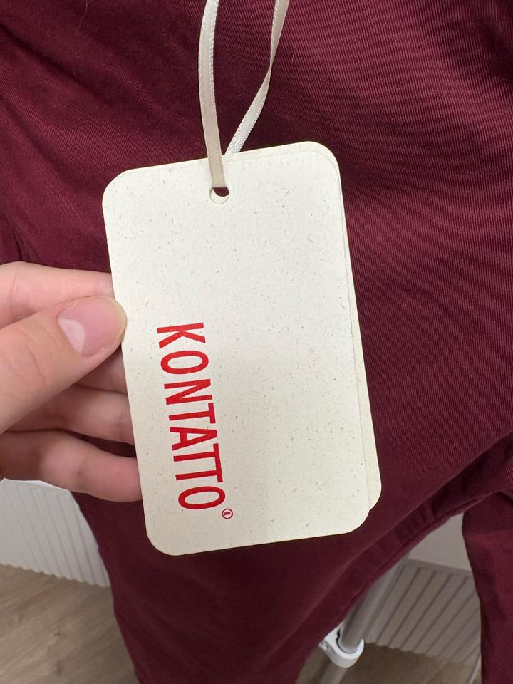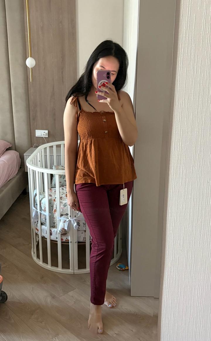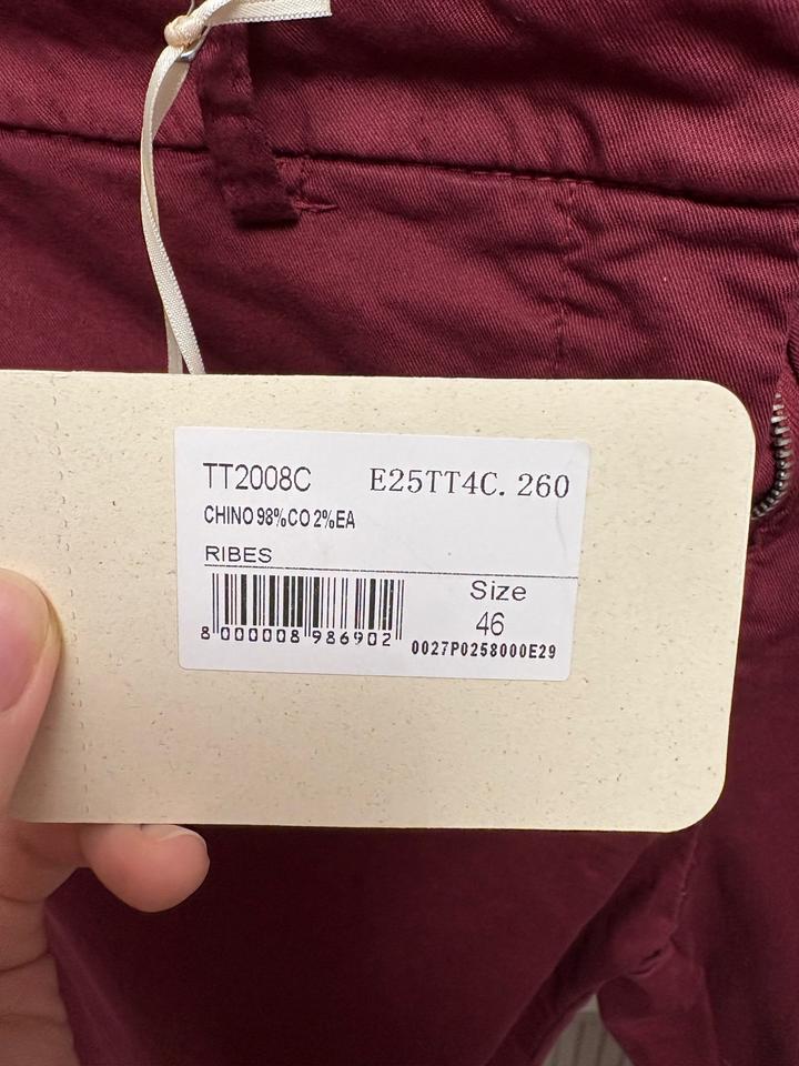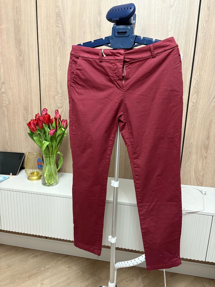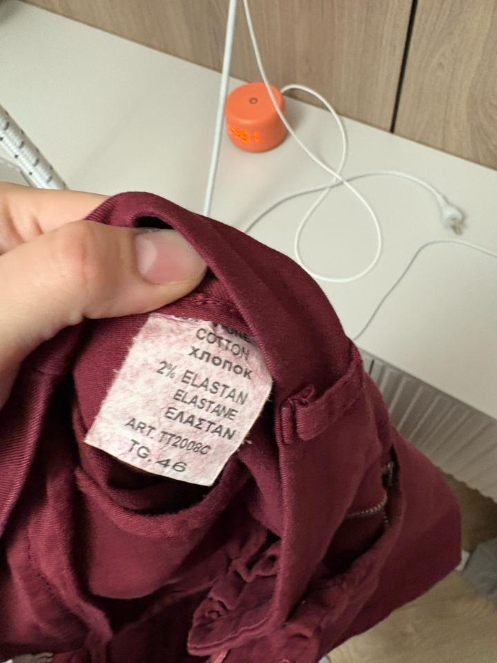 Легкая, немного тянущаяся ткань. Хороший состав - хлопок 98 и эластан 2. Красивый бордовый цвет. На мне сидят так (размер М, рост 168). Брала в Италии, около 25 тысяч стоили. Артикул: 576545