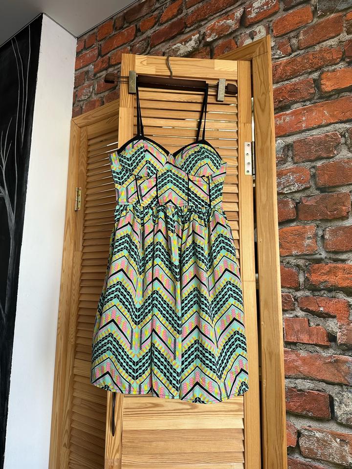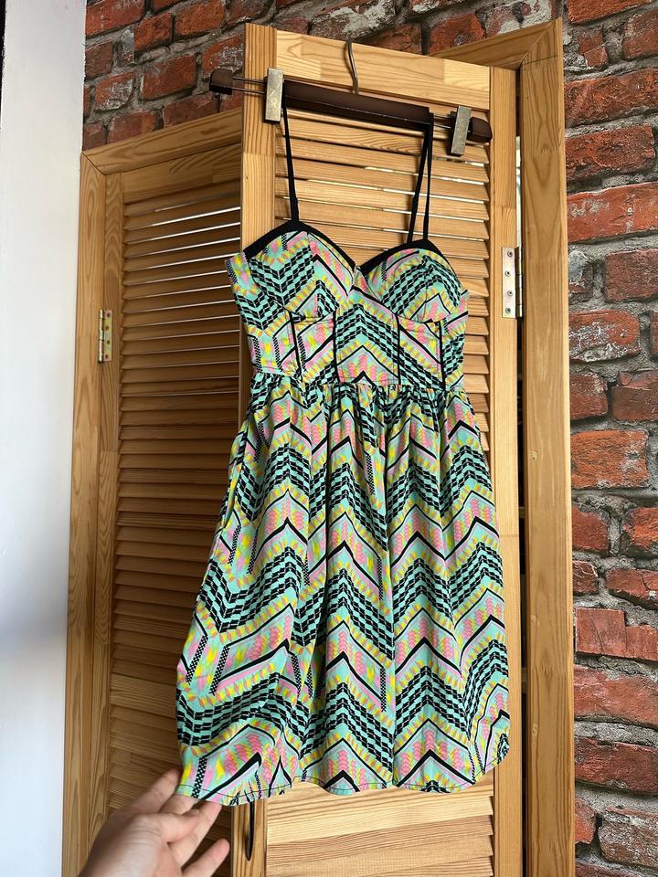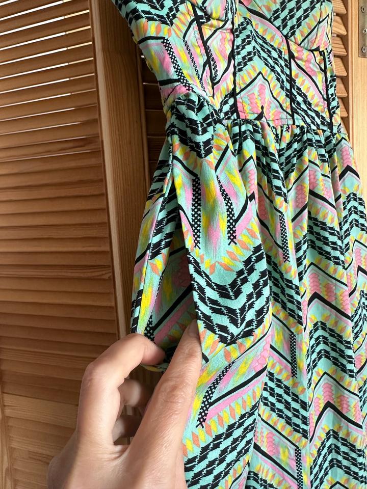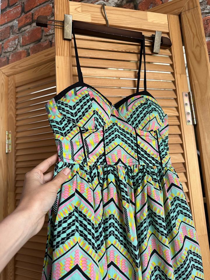 Платье-сарафан American Rag Cie с ярким геометрическим принтом. Лиф-бюстье на тонких регулируемых бретелях отлично подчеркивает декольте. Пышная юбка создает женственный силуэт. Сзади эластичная вставка-резинка, поэтому платье сядет идеально по фигуре. Также есть удобные боковые карманы. В отличном состоянии. Размер XS, также подойдет и на S. Состав ткани: полиэстер, поклад из 100% хлопка. Артикул: 576609