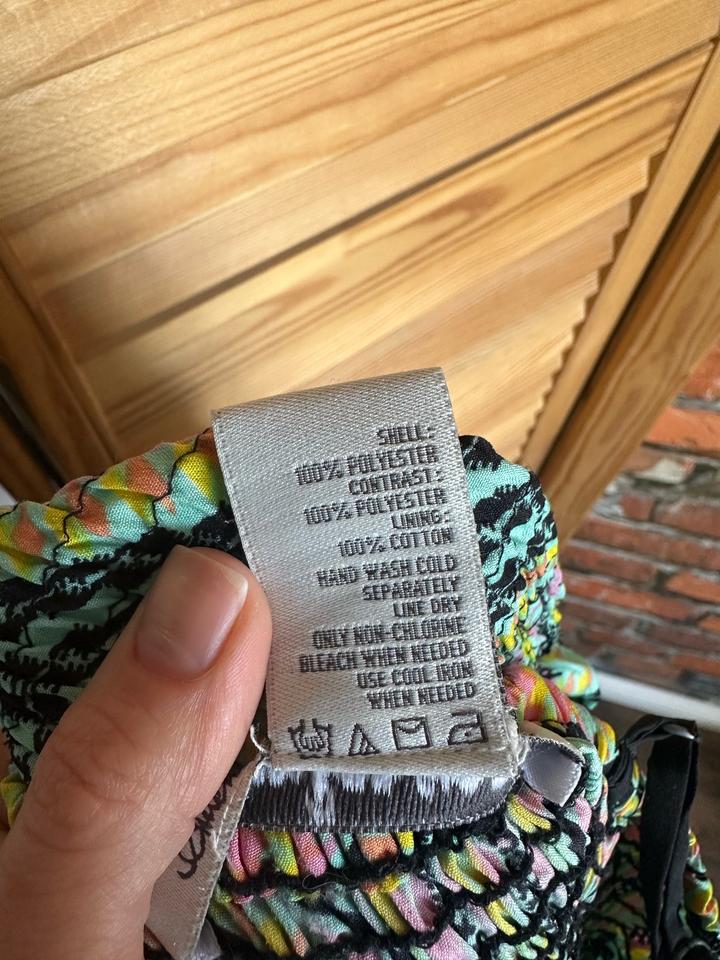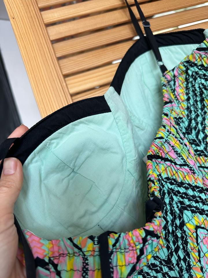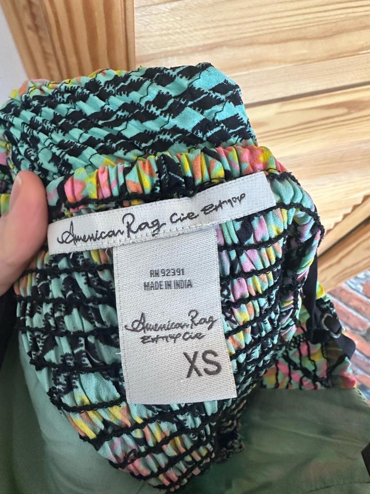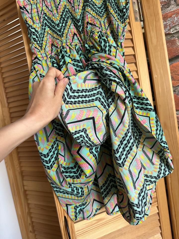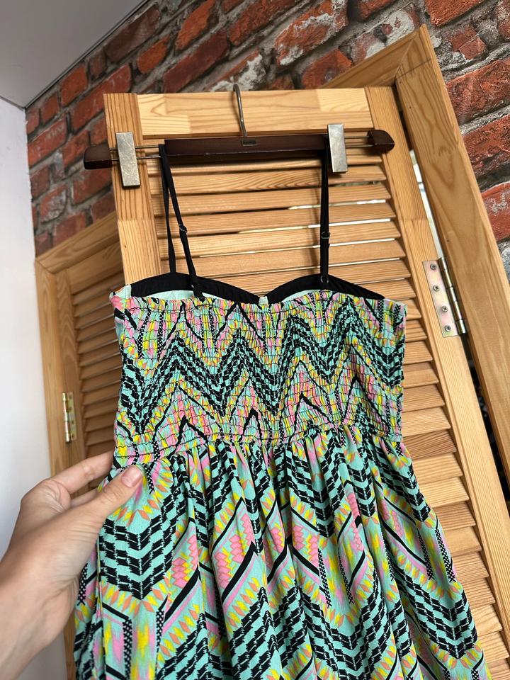 Платье-сарафан American Rag Cie с ярким геометрическим принтом. Лиф-бюстье на тонких регулируемых бретелях отлично подчеркивает декольте. Пышная юбка создает женственный силуэт. Сзади эластичная вставка-резинка, поэтому платье сядет идеально по фигуре. Также есть удобные боковые карманы. В отличном состоянии. Размер XS, также подойдет и на S. Состав ткани: полиэстер, поклад из 100% хлопка. Артикул: 576609