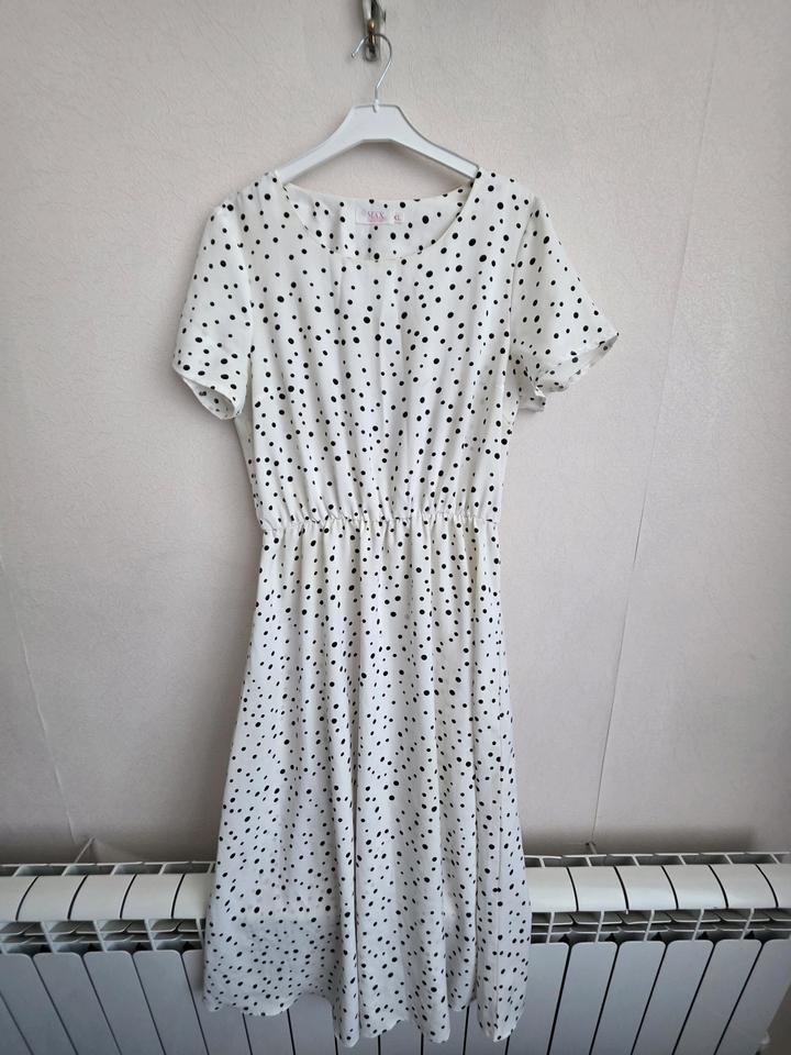 Платье в горох. Размер 46-48. В хорошем состоянии. На рост 165 будет ниже колен. Артикул: 576709