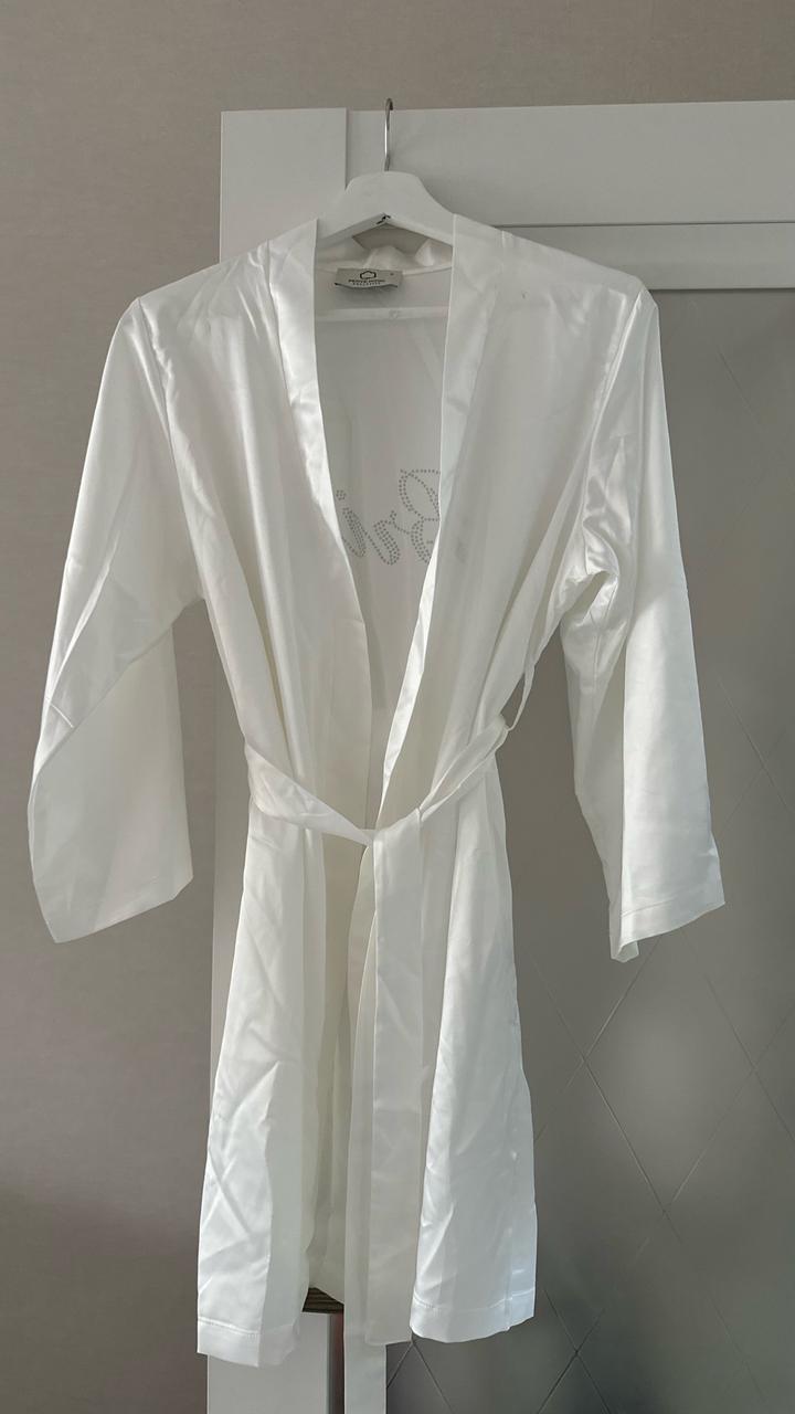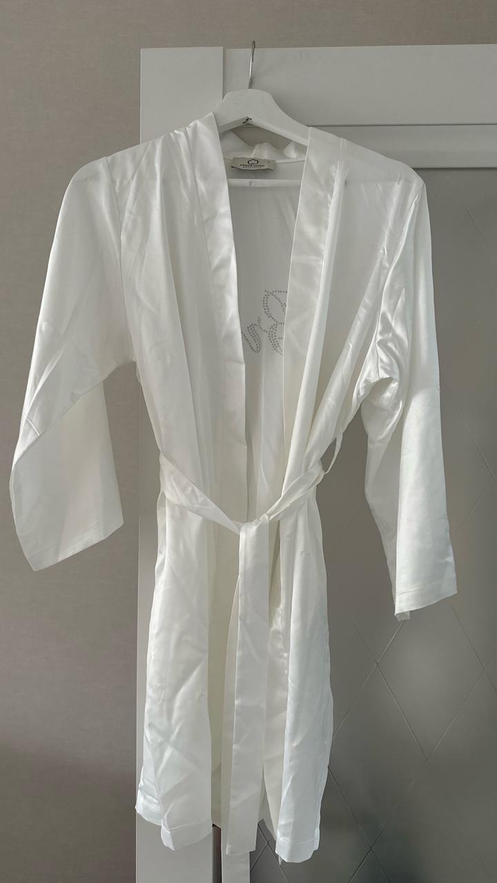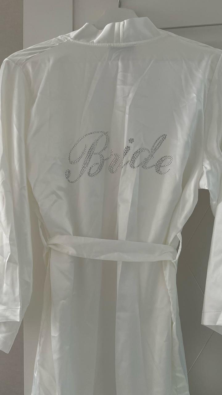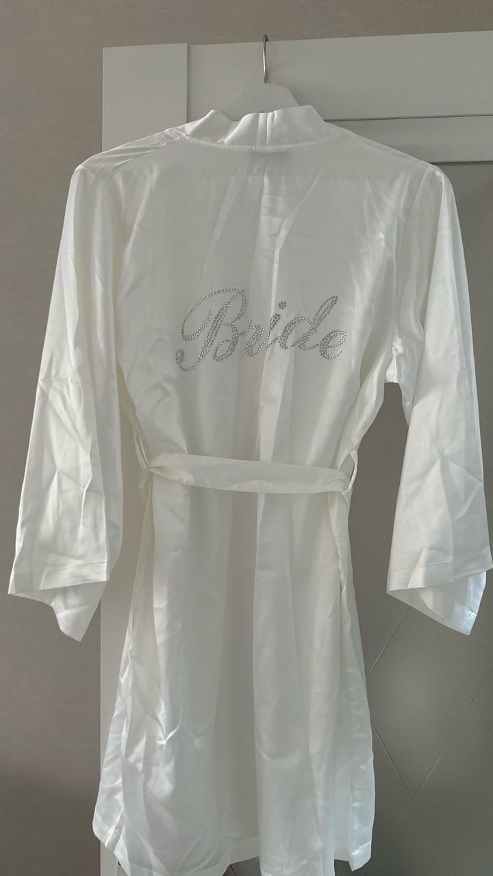 Нежный атласный халат для утра невесты С надписью Bride из страз, красиво смотрится на фото и видео. Идеален для: — сборов невесты — фотосессии — подарка Лёгкий, струящийся, с поясом, красиво подчёркивает силуэт. Размер: S Состояние: отличное / надевался 1 раз Артикул: 576839