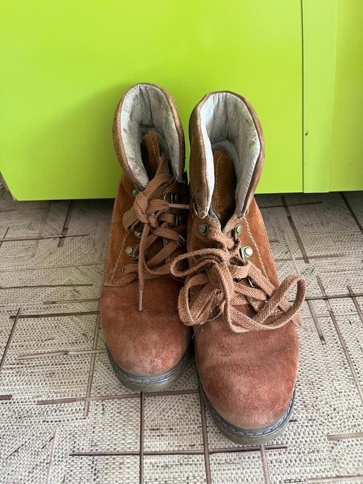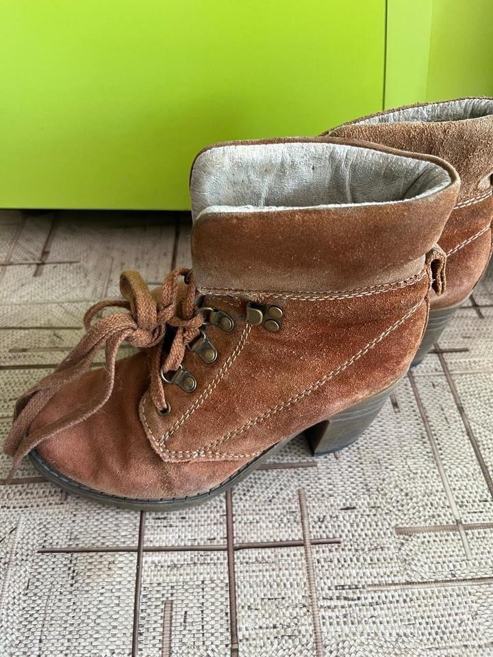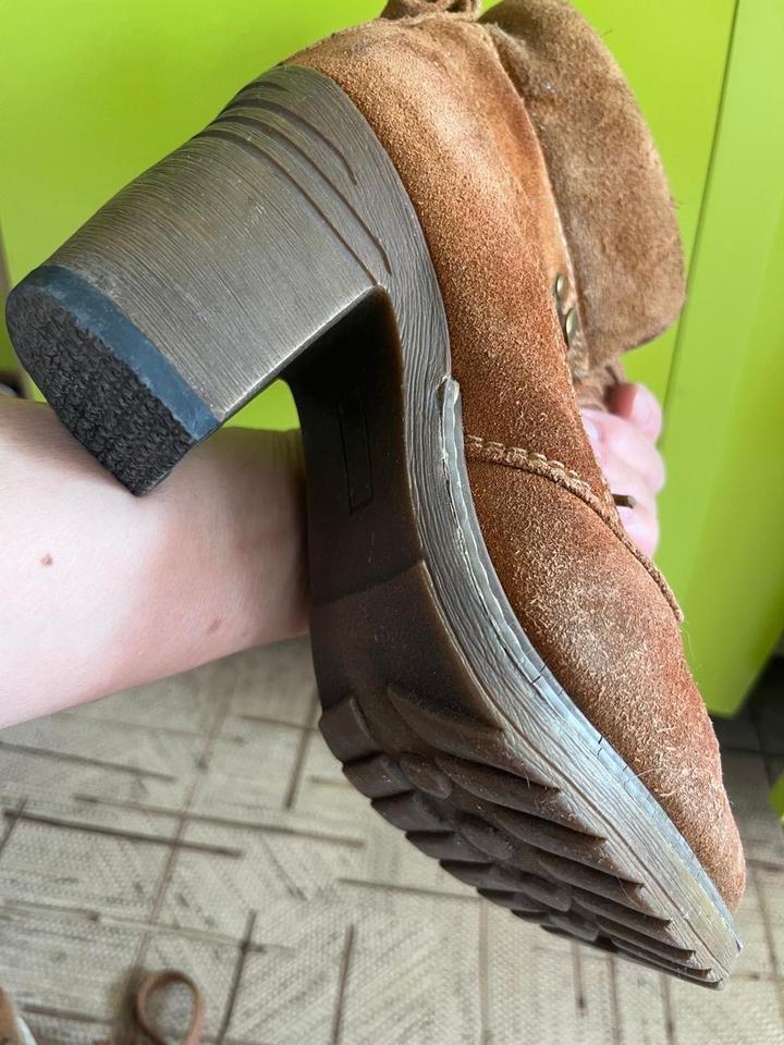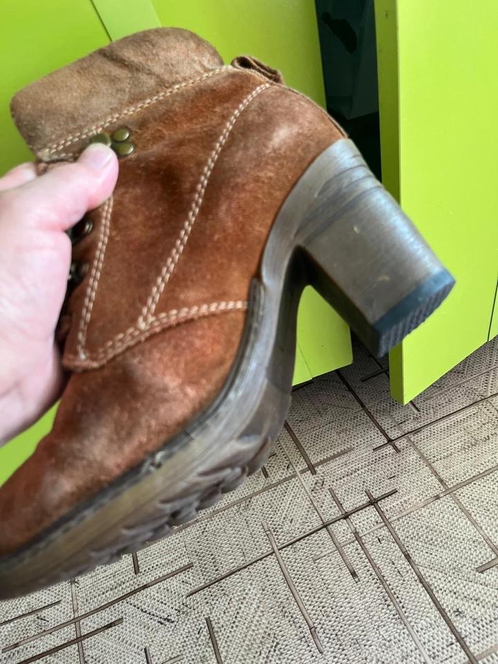 Ботильоны на небольшом каблуке устойчивом из натуральной замши и внутри натуральная овчина германского бренда в целом состоянии грубых дефектов нет, мелкие нюансы возникшие при естественном износе видны на фото, но не являются критичными.Очень крепкие и качественные, химчистку можно сделать для себя и носить с удовольствием, они прослужат еще не один сезон. Зимой , поздней осень или ранней весной в них не замерзнете и не подскользнетесь так как набойки абсолютно новые делала их за 4 тыс. Артикул: 577007