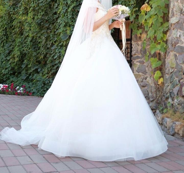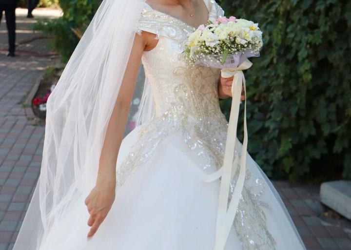 Безумно красивое свадебное платье, с пышной юбкой и корсетом с вышитыми пайетками. Пайетки переливаются золотистыми оттенками. Плечи можно регулировать под свой вкус. Надевала один раз на свадьбу! Состояние почти новое, размер 42. Артикул: 577190