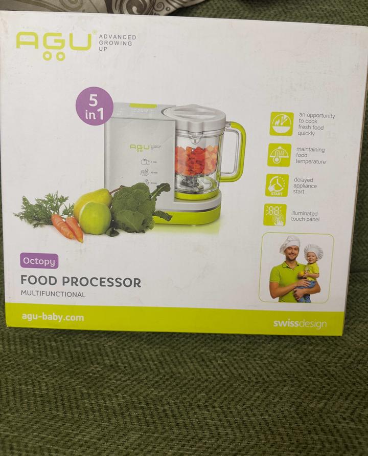 В идеальном состоянии, без запахов Этот продукт — кухонный комбайн для приготовления детского питания AGU Octopy. Функции: Сочетает в себе 5 функций: пароварка (два режима), стерилизатор, блендер (два режима), подогреватель детского питания и поддержание температуры. Особенности: Сенсорная панель управления с подсветкой, функция отложенного старта. Комплектация: Включает расширенный набор аксессуаров. Артикул: 577199
