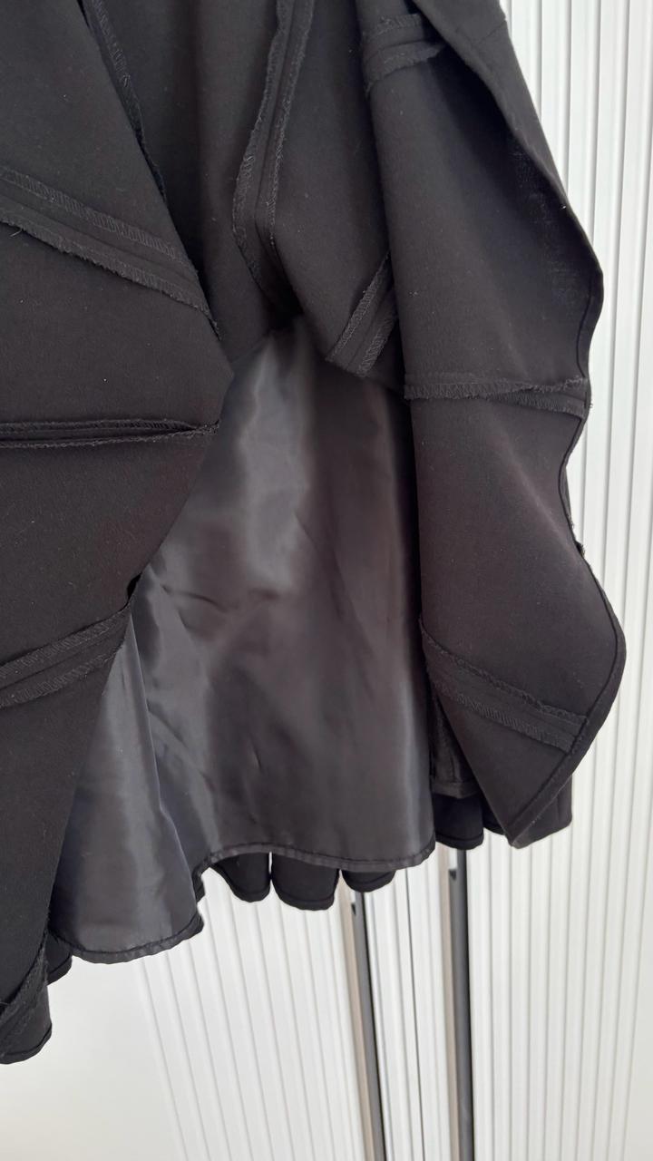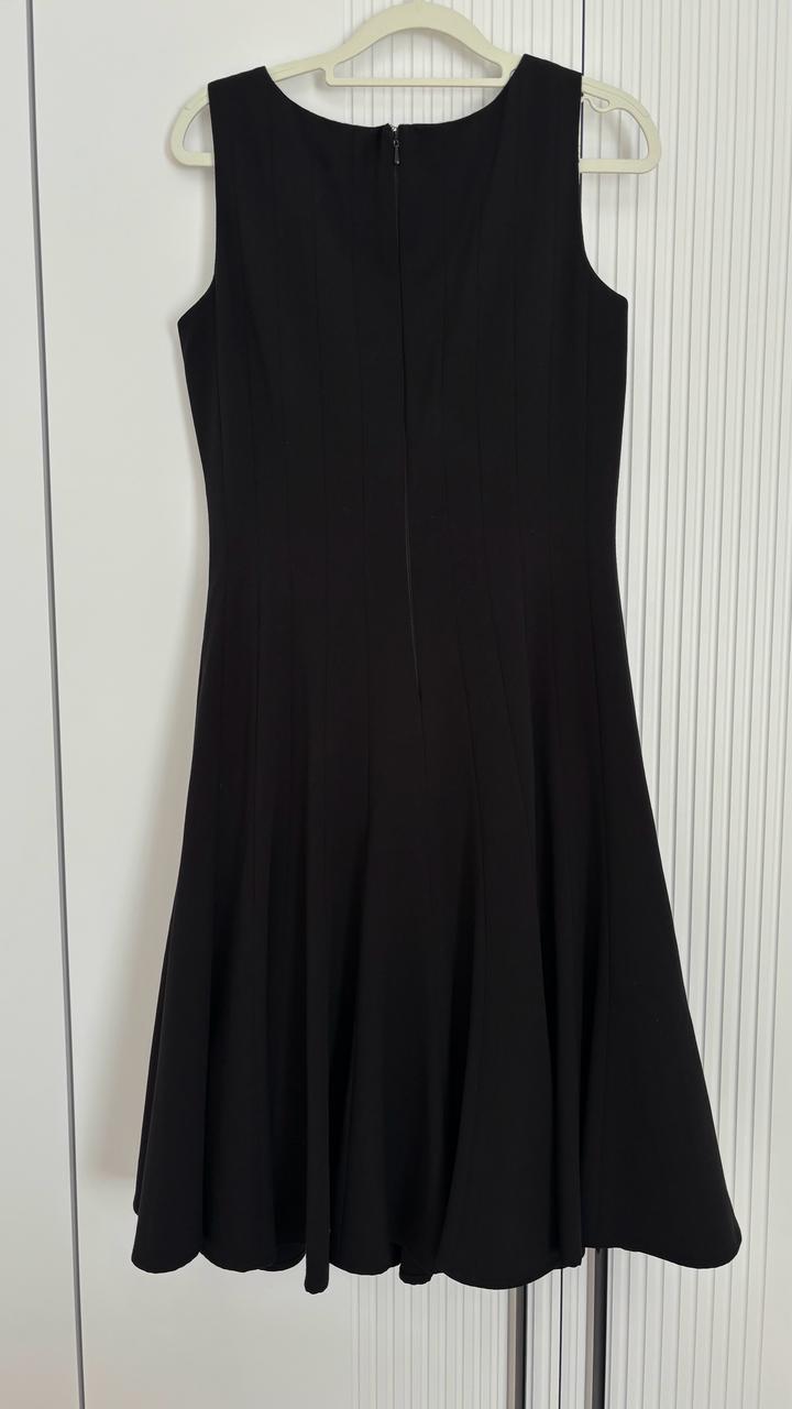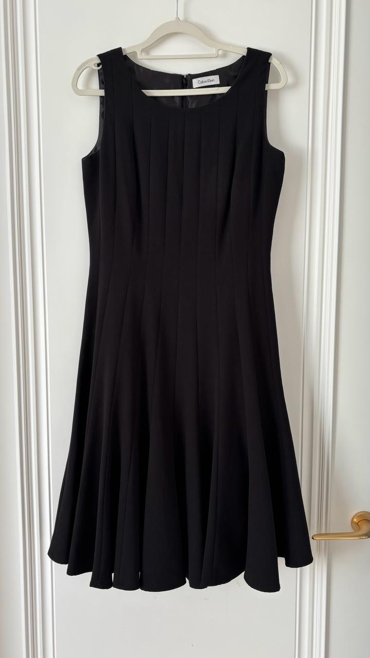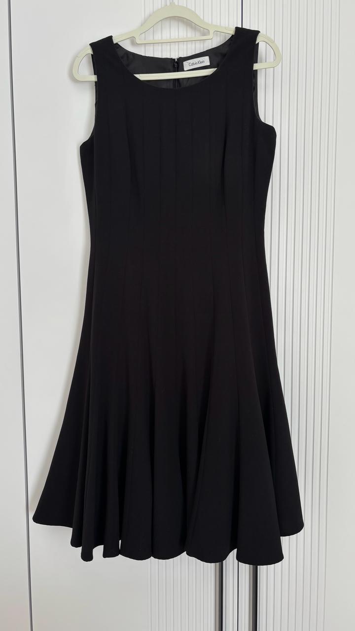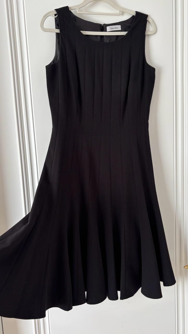 Элегантное чёрное платье от Calvin Klein, выполненное в классическом стиле с приталенным силуэтом и расклёшенной юбкой, которая красиво держит форму. Лаконичный дизайн дополнен аккуратными вертикальными складками спереди, визуально вытягивающими силуэт и придающими образу изящность. Платье отлично садится по фигуре, подчёркивает талию и подходит как для повседневной носки, так и для особых случаев. Состояние отличное, без дефектов. Артикул: 577366