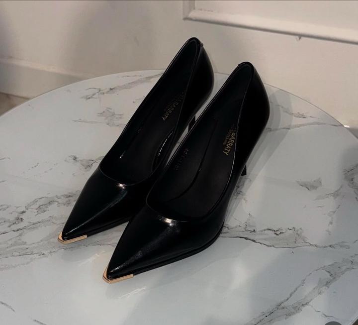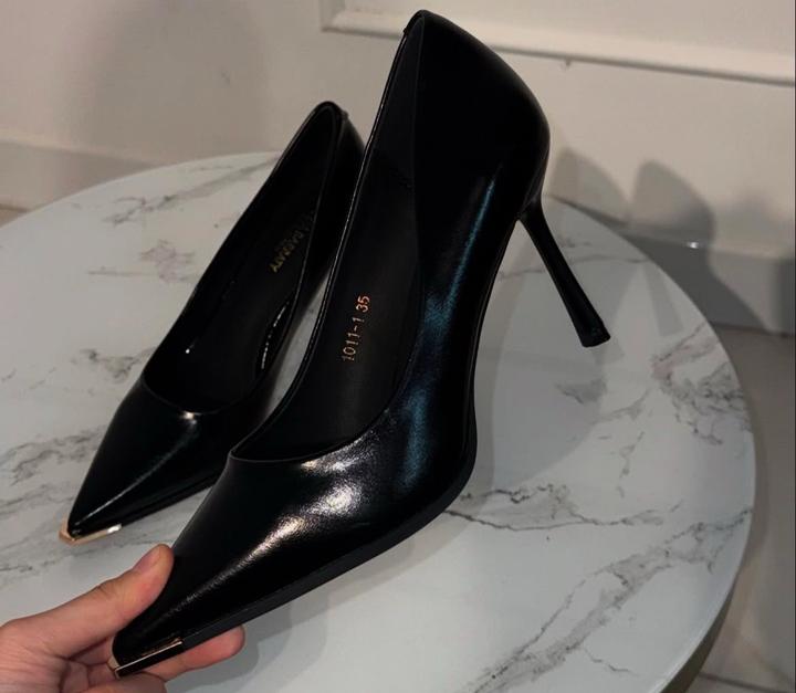 Дизайн: Острый мыс с эффектной золотистой вставкой. • Особенность: Глубокий боковой вырез, который визуально удлиняет ноги и делает образ изящным. • Цвет: Классический черный, мягкий глянец. • Размер: 3+7### ### ## ##й образ. Артикул: 577589