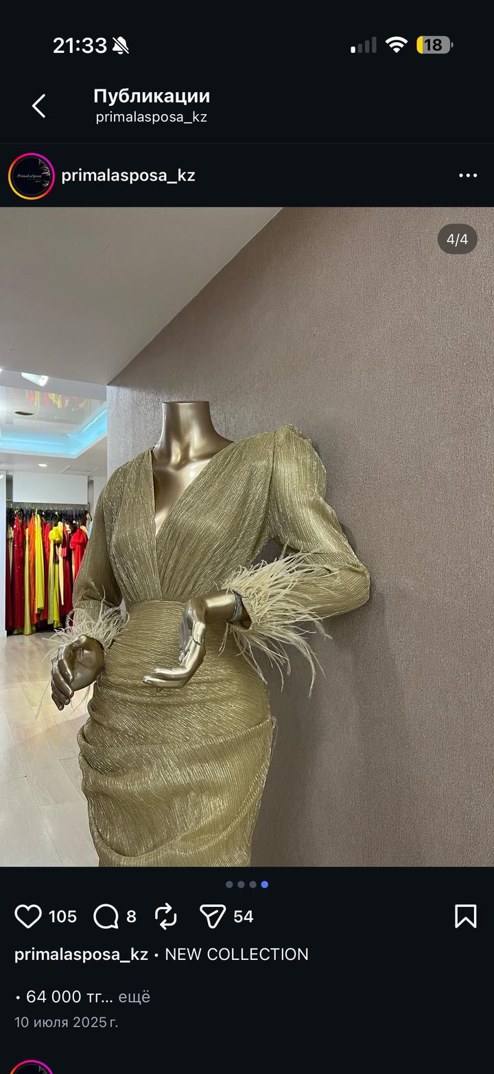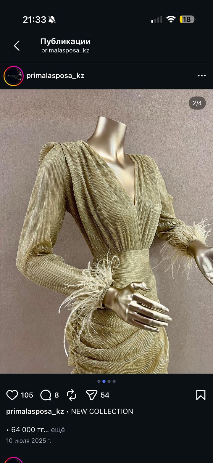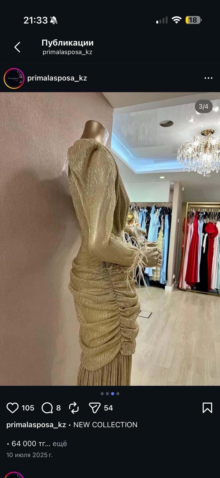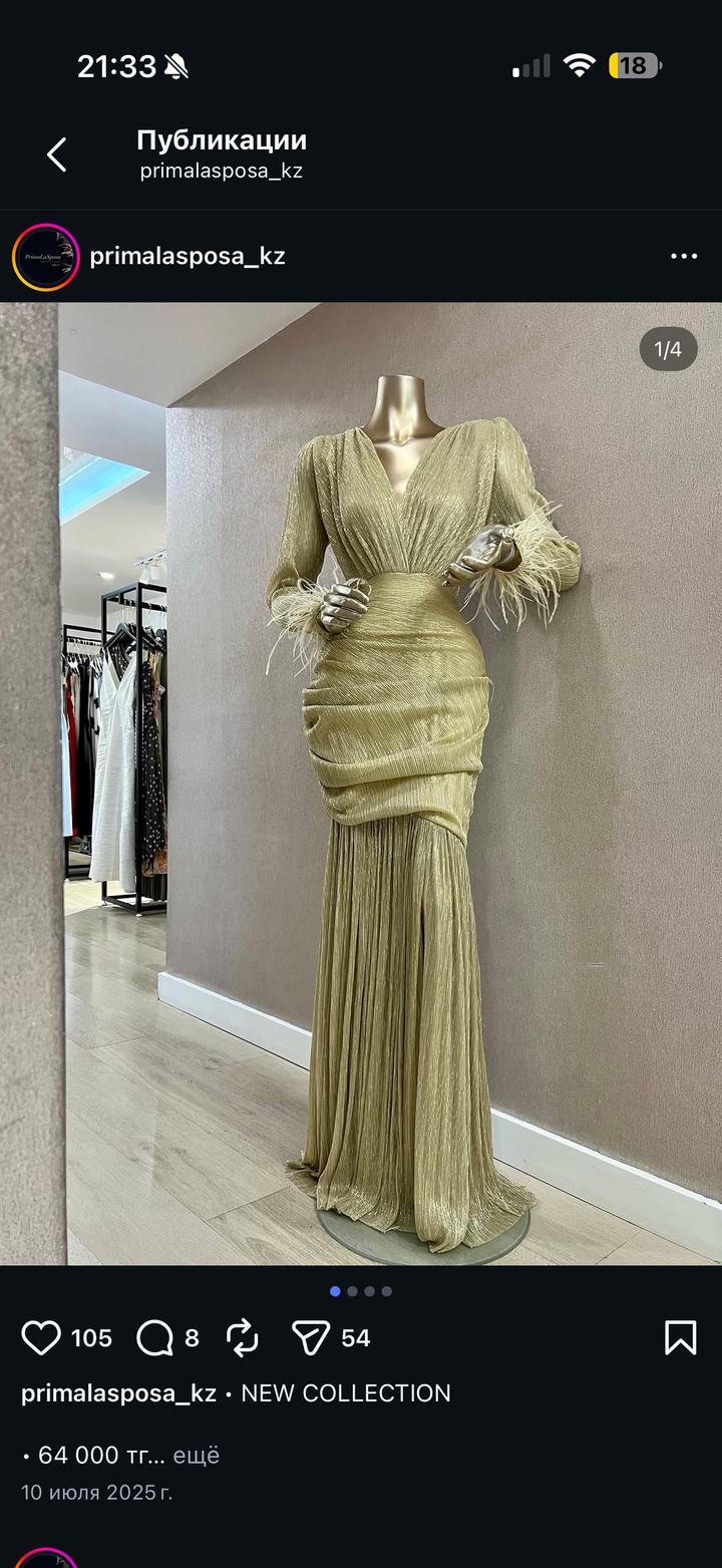 Брала это платье на мероприятие, выход только 1 раз, состояние отличное, брала в самом магазине Primalasposa в Алматы за 64.000 тг Артикул: 577619