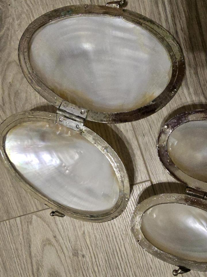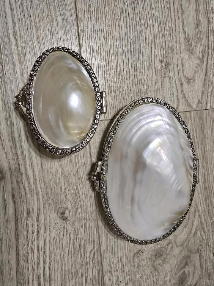 Натуральные ракушки, металлический надежный ободок, крепко закрываются. Продаются вместе, побольше и поменьше. Парные для Мам и Дочек. Маленькая помещается в большой, привезены из Тайланда. Артикул: 577908