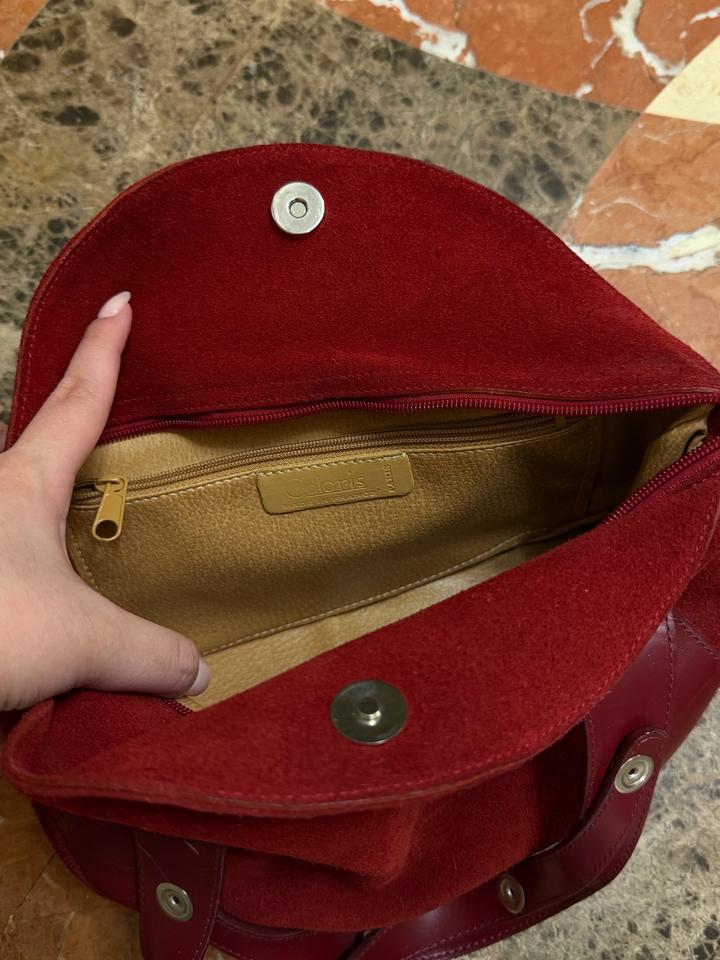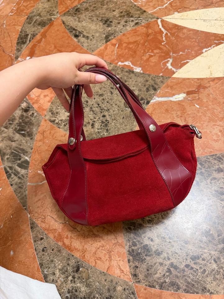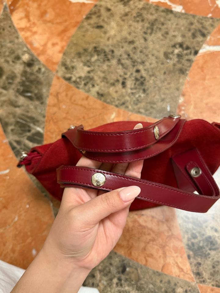 Небольшая, но глубокая красная винтажная сумка Замша и кожа В отличном состоянии Длина ремешка регулируется за счет кнопок Французский бренд Артикул: 577985