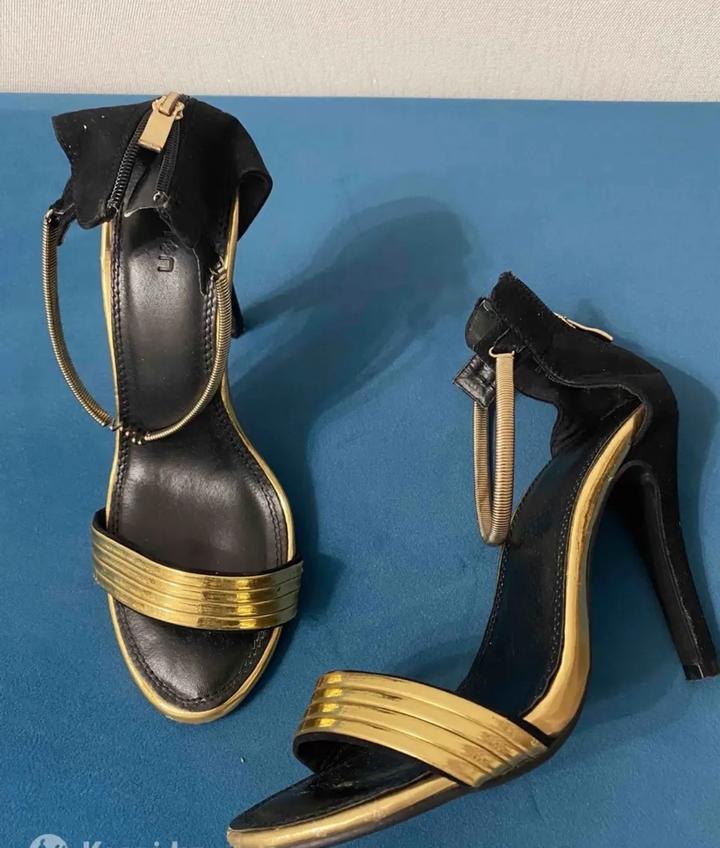 женские босоножки на высоком каблуке-шпильке с черной замшей и золотистыми металлическими элементами. Артикул: 578295