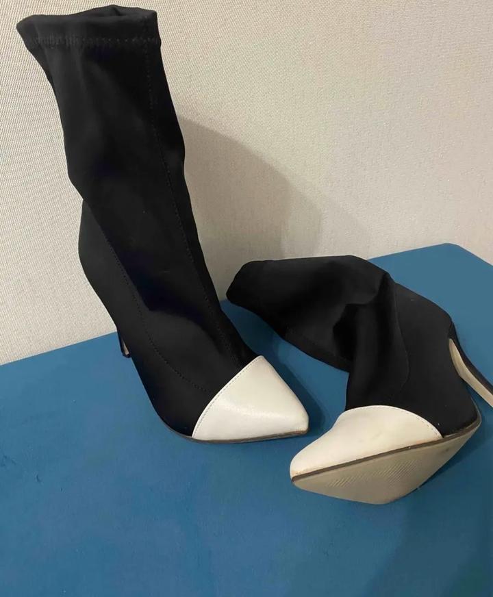 женские ботильоны-носки (sock boots) черного цвета с контрастным белым мыском. Эта модель отличается облегающим верхом из эластичного материала, заостренным носком и тонким высоким каблуком-шпилькой. Артикул: 578307