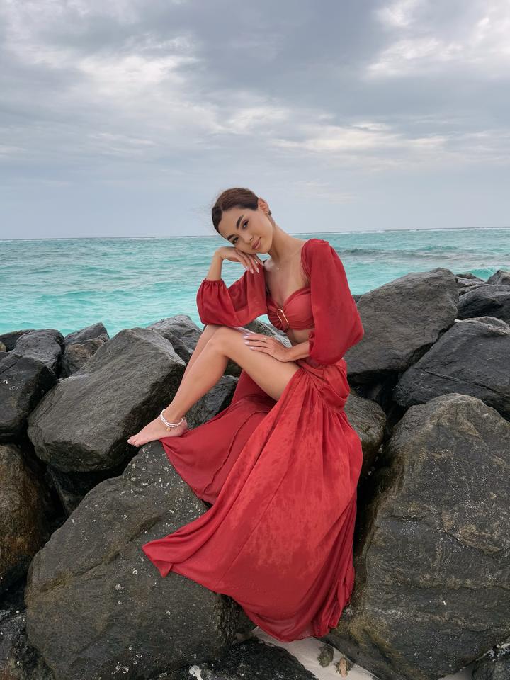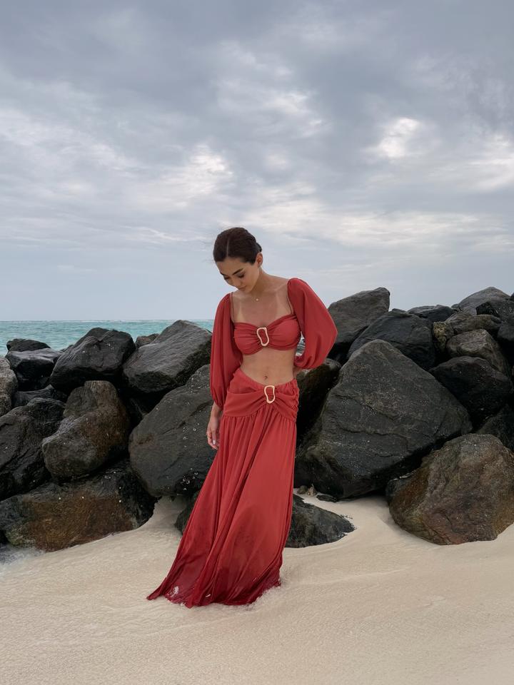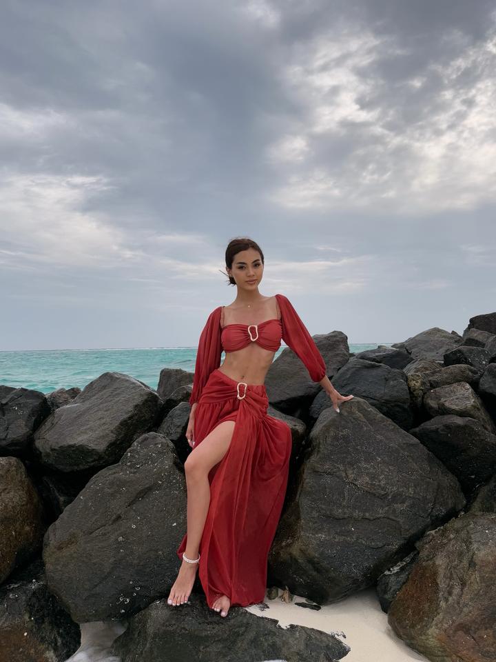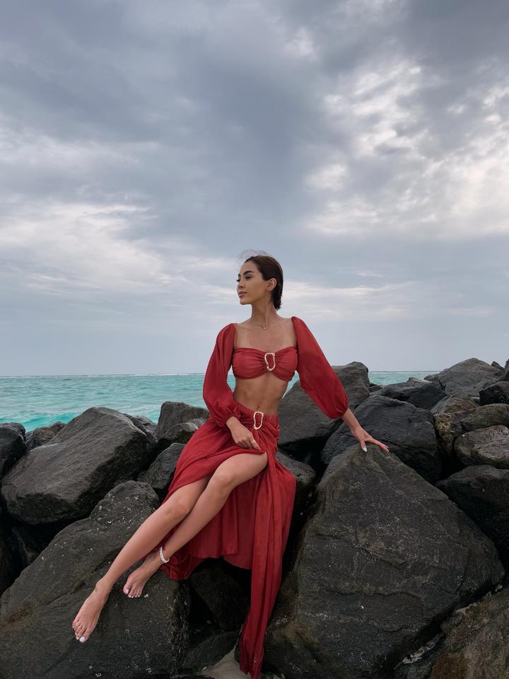 Эффектный пляжный костюм (двойка) в ярком оттенке ✨ Топ + длинная юбка с разрезом, красиво открывает талию и подчёркивает фигуру. В стиле «Аладдин» — лёгкий, летящий и очень женственный. Размер S, надевался только 1 раз, состояние идеальное, без дефектов. Артикул: 578328