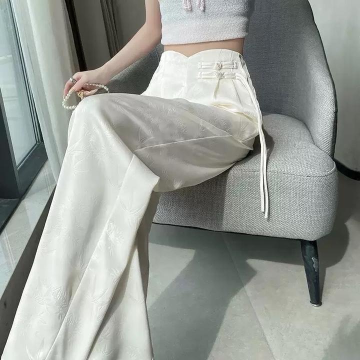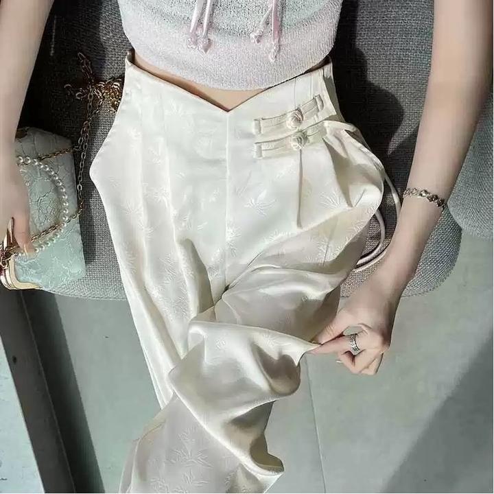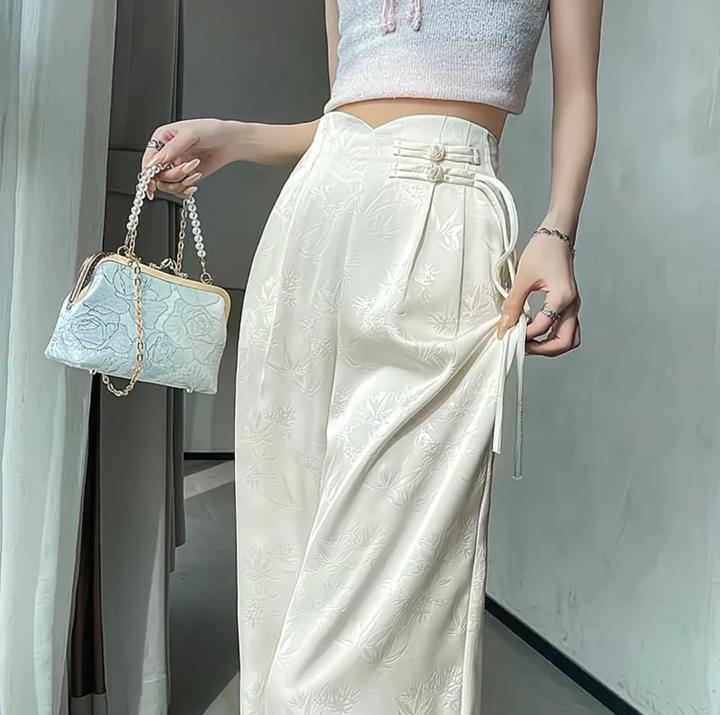 ✅ Силуэт: Свободные от бедра (палаццо), визуально стройнят. • ✅ Материал: Ткань с атласным блеском и вышивкой «тон в тон». • ✅ Посадка: Высокая, пояс фиксируется на декоративные застежки. • ✅ Цвет: Нежный жемчужный / Айвори. Характеристики: • Тип: Брюки палаццо / Широкие брюки Артикул: 578423