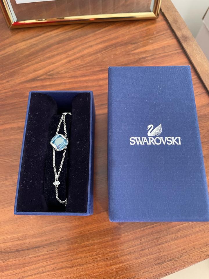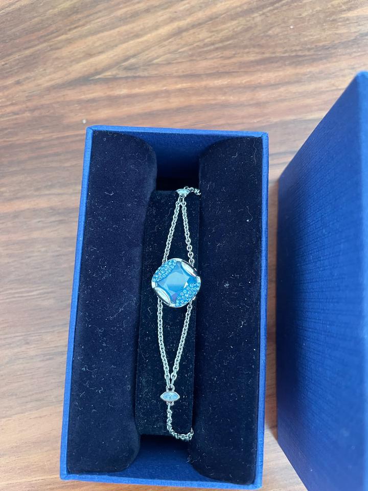 Элегантный браслет от Swarovski с сияющим голубым кристаллом. Очень нежно смотрится на руке, переливается на свету и добавляет образу свежести. * Бренд: Swarovski * Размер: регулируемый (подойдёт на любую руку) * Цвет: серебристый + голубой кристалл * Материал: металл с покрытием + кристалл Swarovski * Тип застёжки: регулируемая цепочка Идеально: — на каждый день — на подарок — под летние и лёгкие образы В комплекте фирменная коробка. Состояние: отличное. Артикул: 578439