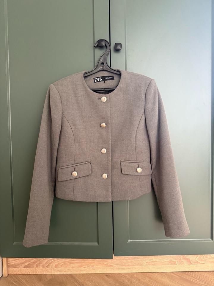 Стильный укороченный жакет в базовом бежево-сером оттенке. Аккуратный крой, подчёркивает фигуру, выглядит дорого за счёт лаконичного дизайна и пуговиц. Артикул: 578453