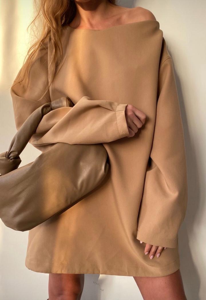 Платье / удлинённый свитшот USHATÁVA Стильное oversize платье в оттенке карамель/беж. Минималистичный дизайн в эстетике «тихой роскоши». Свободный крой, спущенное плечо, выглядит очень современно и дорого. Артикул: 578469