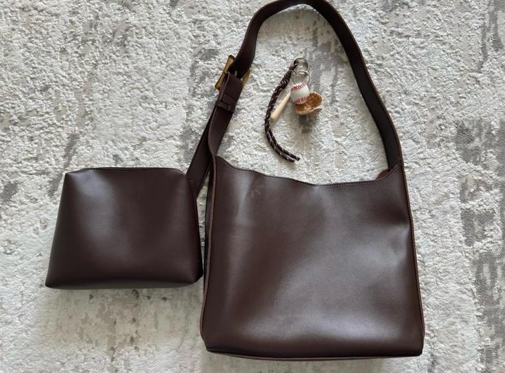 сумка тоут, цвет кофе, в идеальном состоянии, рядом маленькая сумочка, и брелок в подарок ширина 25см, длина 27см Артикул: 578675
