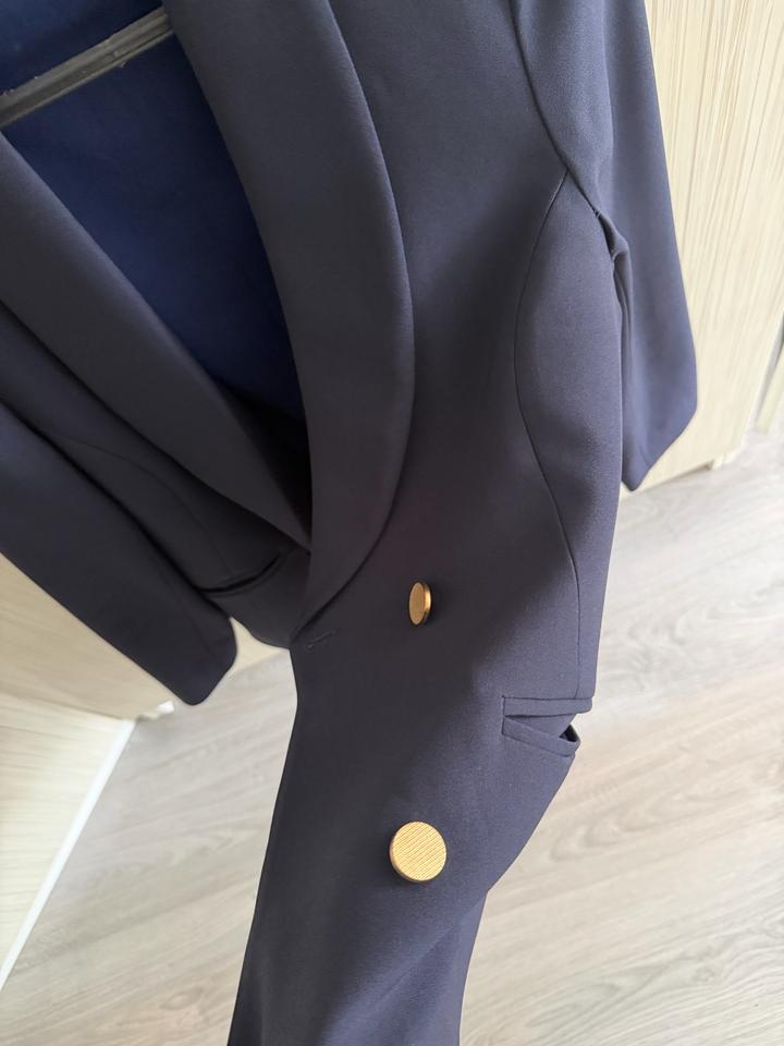 Очень стильный темно-синий пиджак с золотыми пуговицами. Смотрится дорого, элегантно и актуально. Отлично подойдет для офиса, деловых встреч и повседневных образов. Красиво сочетается как с классическими брюками, так и с джинсами. Артикул: 578742