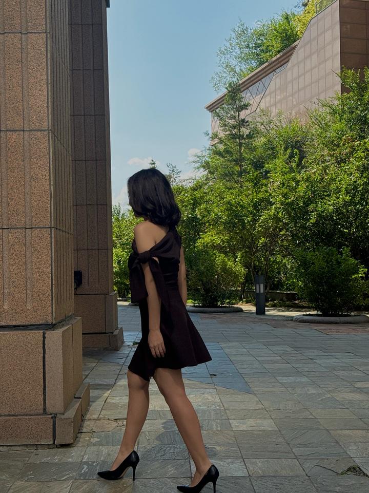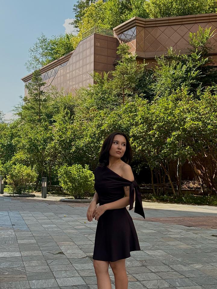 Мини-коричневое платье выше колена, мой рост 160 см, на одно плечо, на завязке. Артикул: 578805