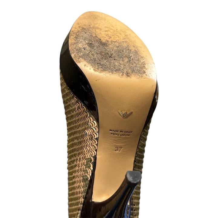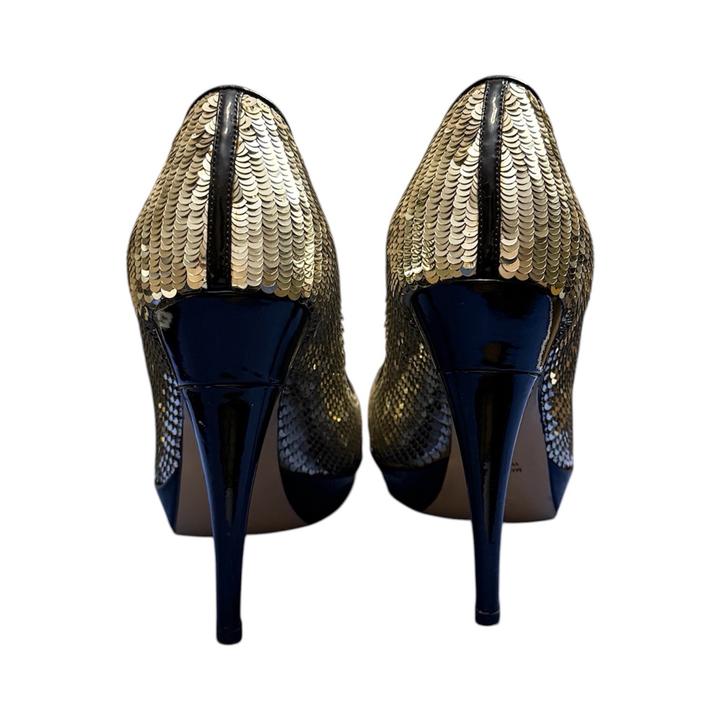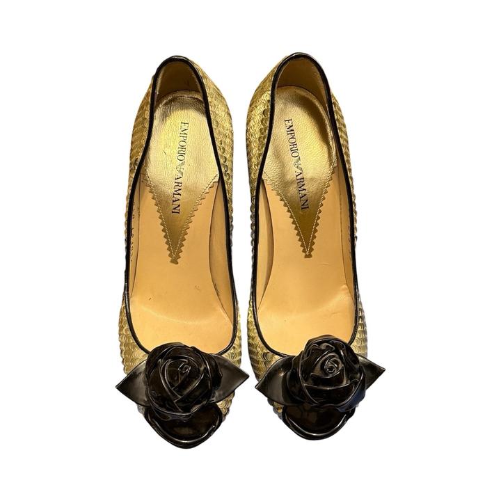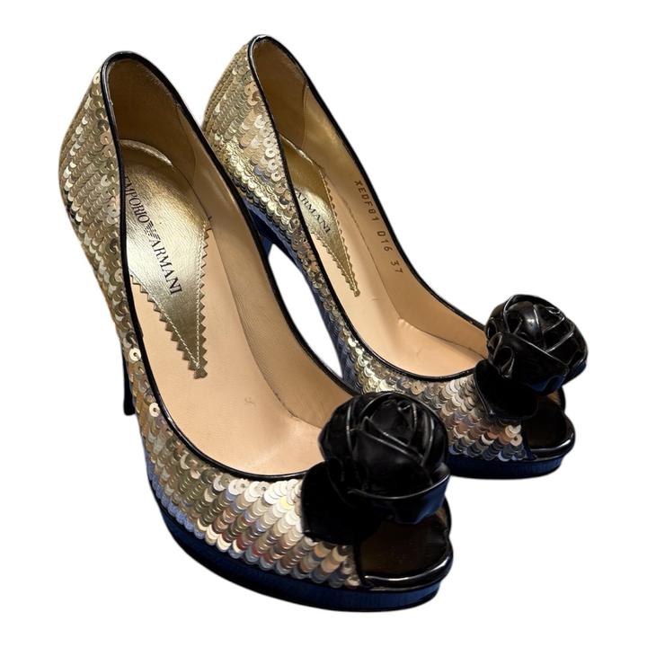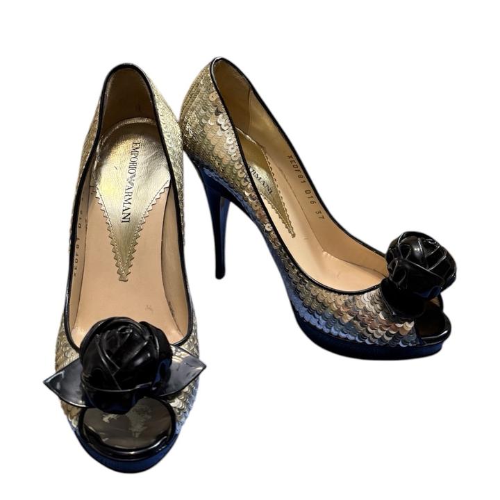 Вечерние туфли с открытым носком Emporio Armani. Полностью покрыты сверкающими пайетками платиново-золотистого цвета. На носке расположена объемная аппликация в виде черной розы, выполненной из лакированной кожи. Сверху в идеальном состоянии, все пайетки на месте. По подошве видно, что туфли носились. Актуальное состояние на фото Без коробки Артикул: 579001