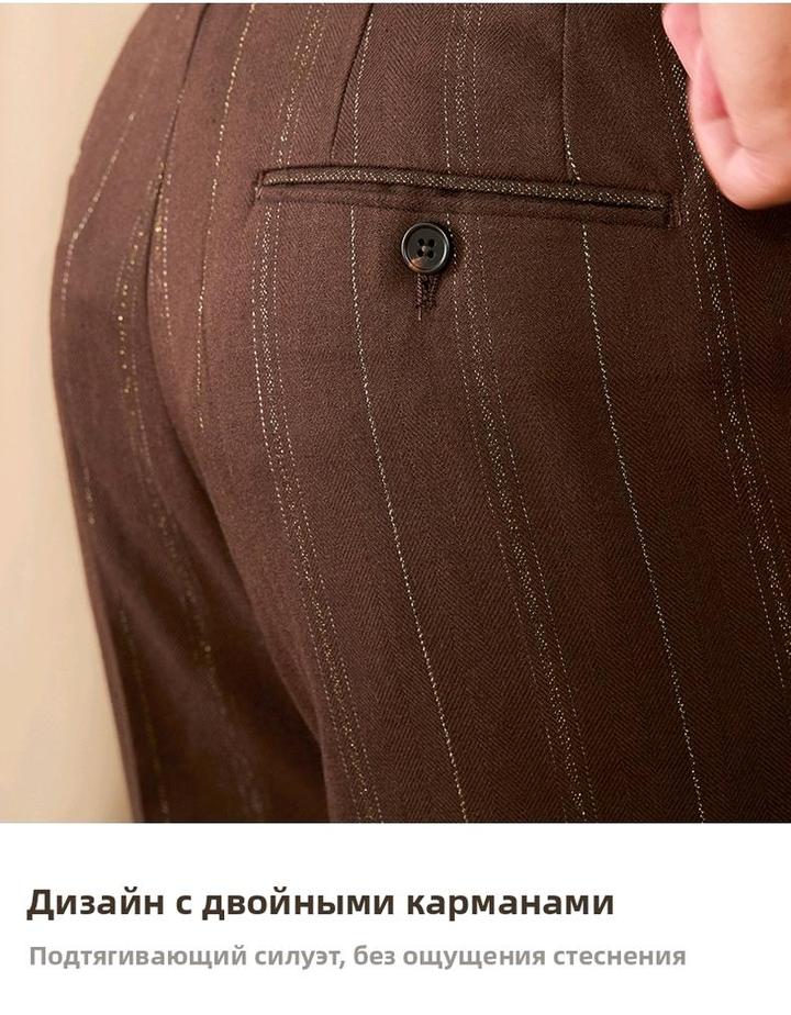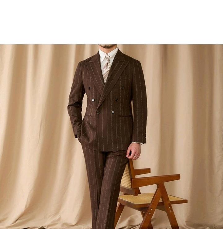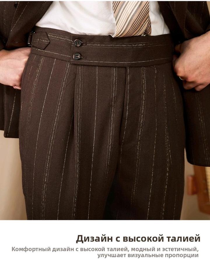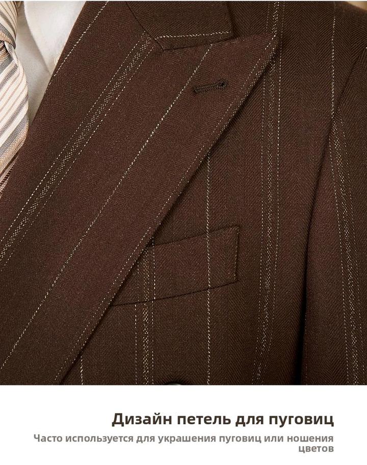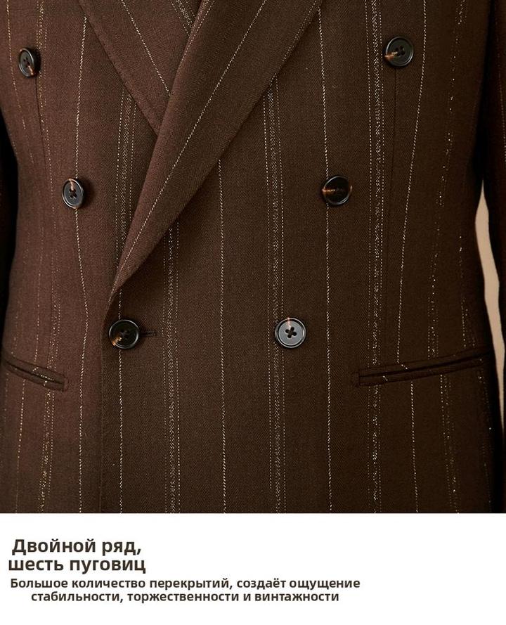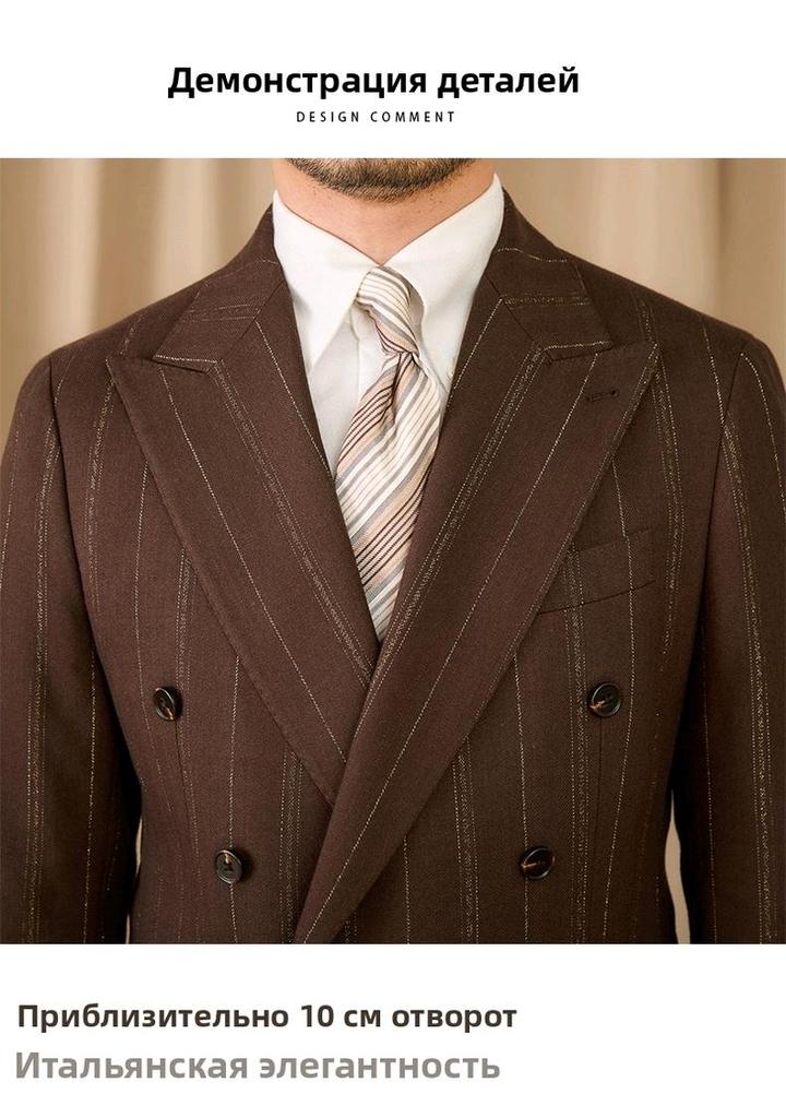Итальянский винтаж. Двубортный костюм в мягком крое «Неаполя» (естественное плечо, свобода движений). Цвет: коричневый с бело-золотой полосой. Лацканы широкие — 10 см. Брюки с высокой талией, стрелками и свободными складками. Пиджак XXXL (широкий), брюки 34. Сезон осень-весна. Идеально для статусного повседневного образа. Артикул: 579123
