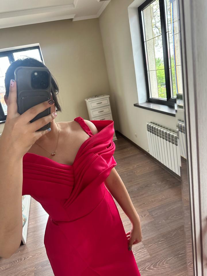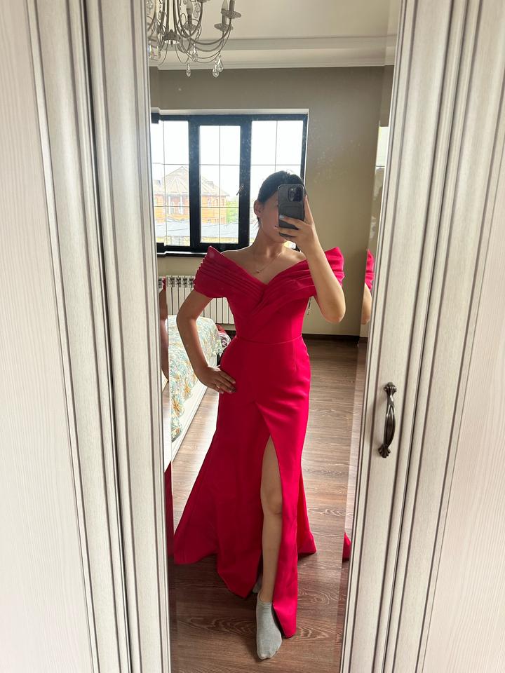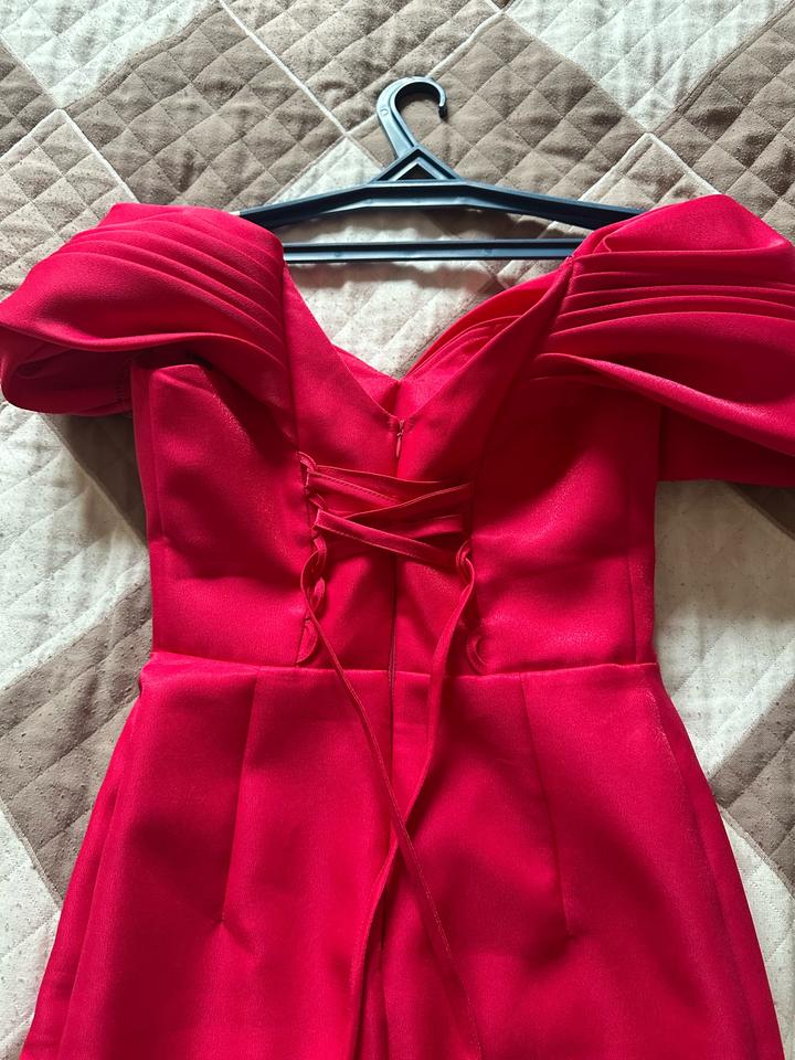Красно-розовое платье фасона «рыбка» с разрезом по ноге. Корсетный верх со шнуровкой и со спущенными рукавами на бретелях. Идеально подойдет для выпускного вечера и других мероприятий. Артикул: 579196