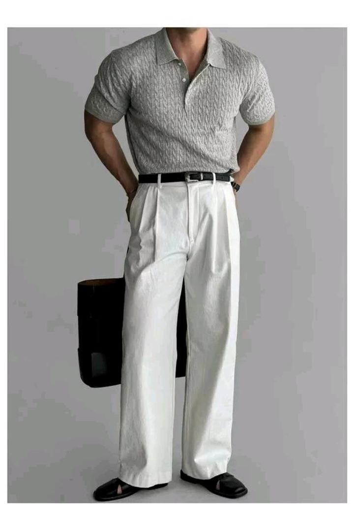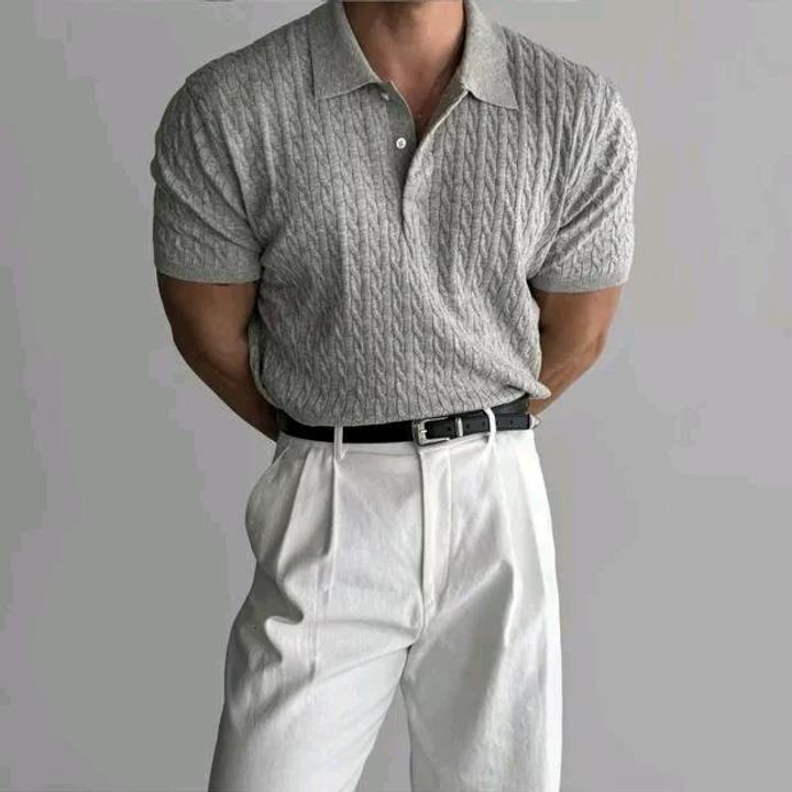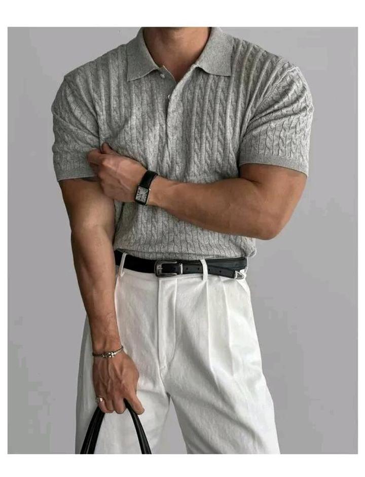 Oldman Knit. Винтажное трикотажное поло XXXL. Серый меланж, фактурная вязка. Фишка модели — широкий мягкий ворот и облегающие ман+7### ### ## ##таж. Для тех, кто ценит комфорт и статусную небрежность. Артикул: 579218