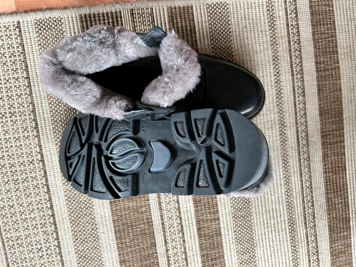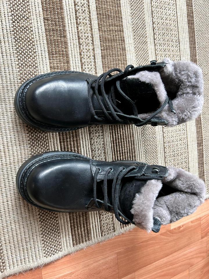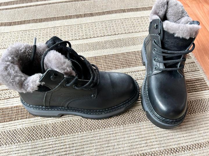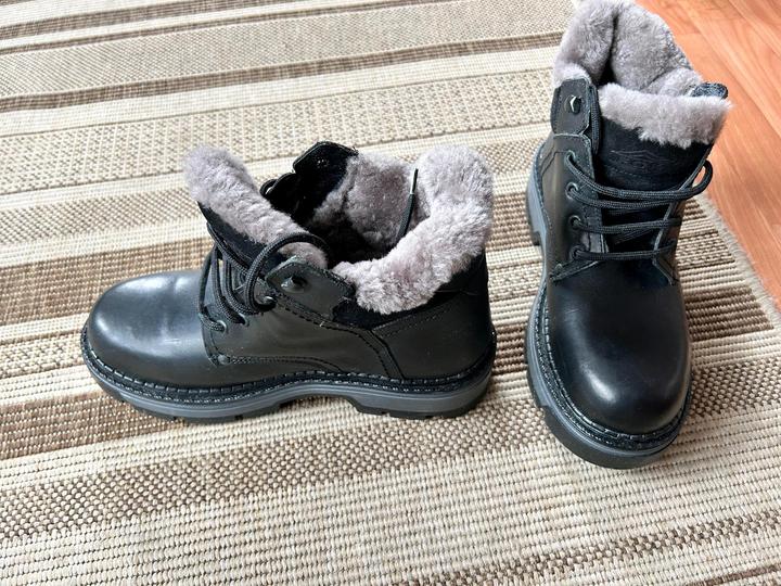 Черные ботинки зима, мех густой.Кожа нет незнаю брали за 26 000, новые без коробки.Размер40.Не подошел размер,большеватые сколько см по стельке не знаю Артикул: 579365