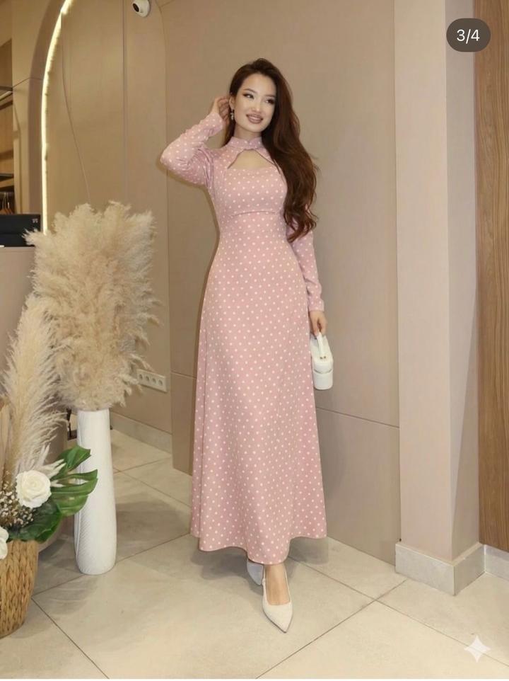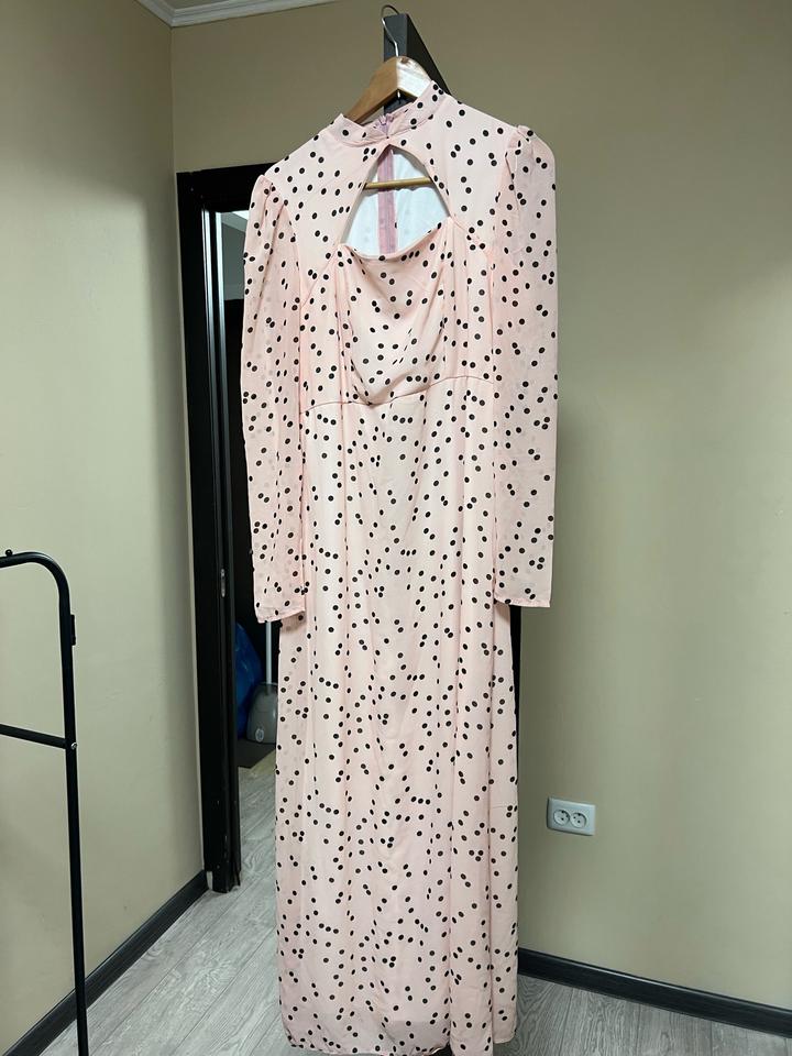 Платье розовое с завязками сзади. Платье в пол, шифон. Сидит как на первом фото, просто горошки черные. Продаю так как размер не подошел, ни разу не носила, новое Артикул: 579475