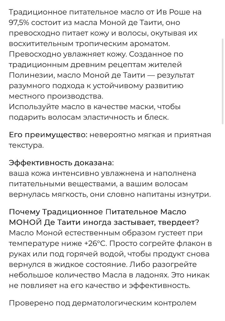 Питательное пасло для тела и волос Monoi de Tahiti 100ml от Yves Rocher Стоимость 10.000 тг В наличии 4 штуки Стеклянная бутылка, чудесный аромат. Наьуральные ингредиенты, при температуре ниже 26 градусов густеет и перед использованием нужно разогреть в руках. Идеально подходит для массажа Артикул: 579721