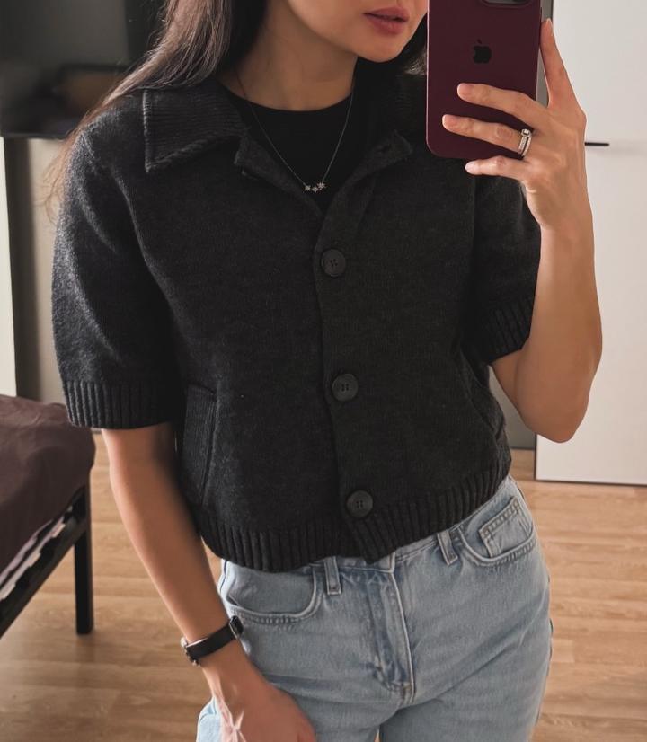 Темно-серый кардиган с коротким рукавом на пуговицах с добавлением шерсти Артикул: 579724