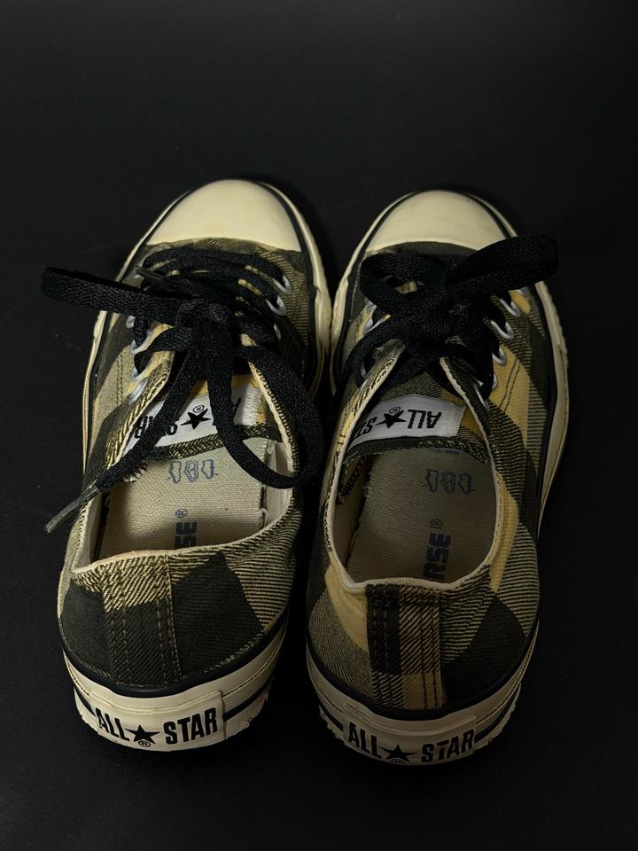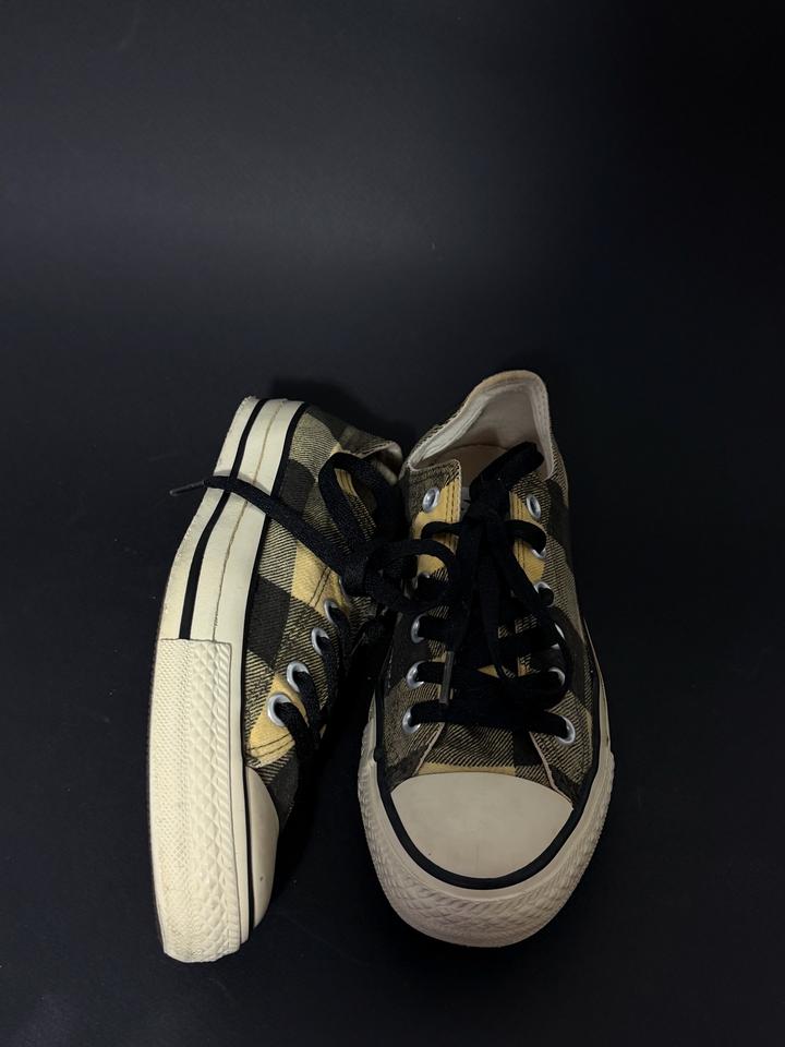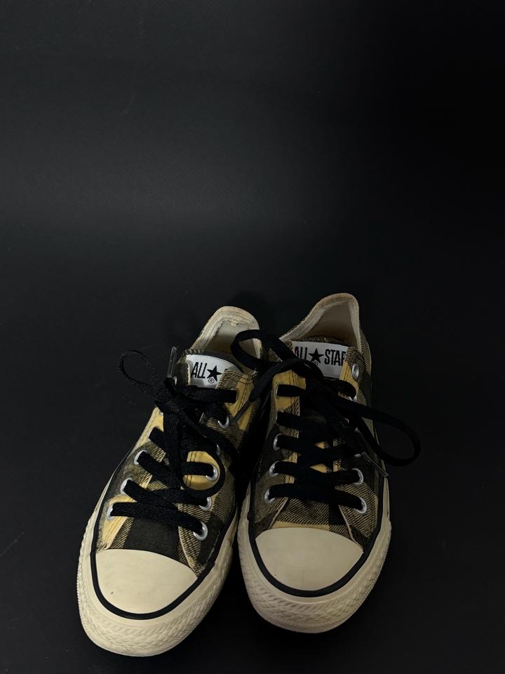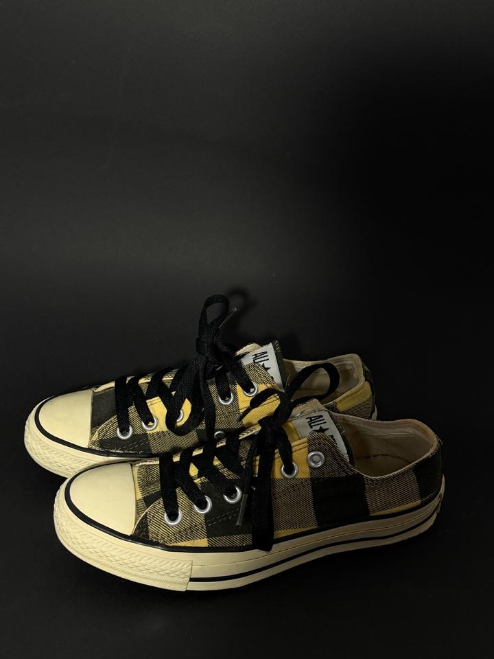 низкие кеды Converse Chuck Taylor All Star с текстильным верхом в желто-черную клетку (баффало). Модель имеет классический силуэт: резиновый мысок кремового цвета, черную шнуровку с металлическими люверсами и фирменный логотип на язычке Артикул: 579853