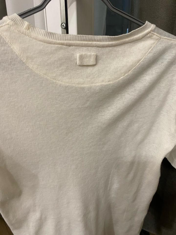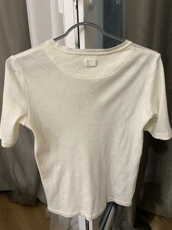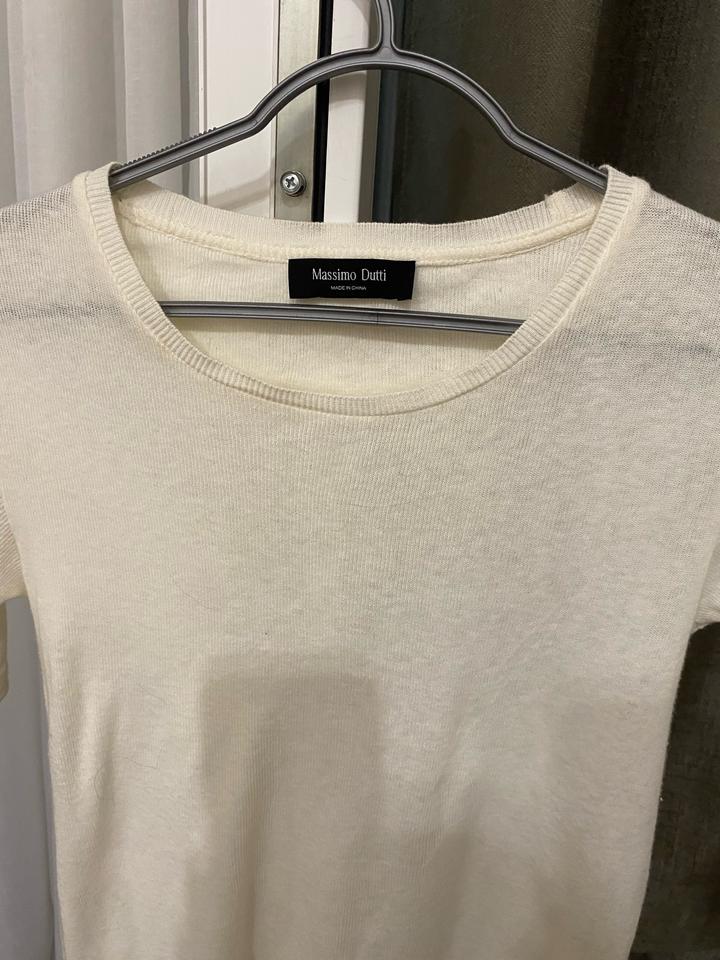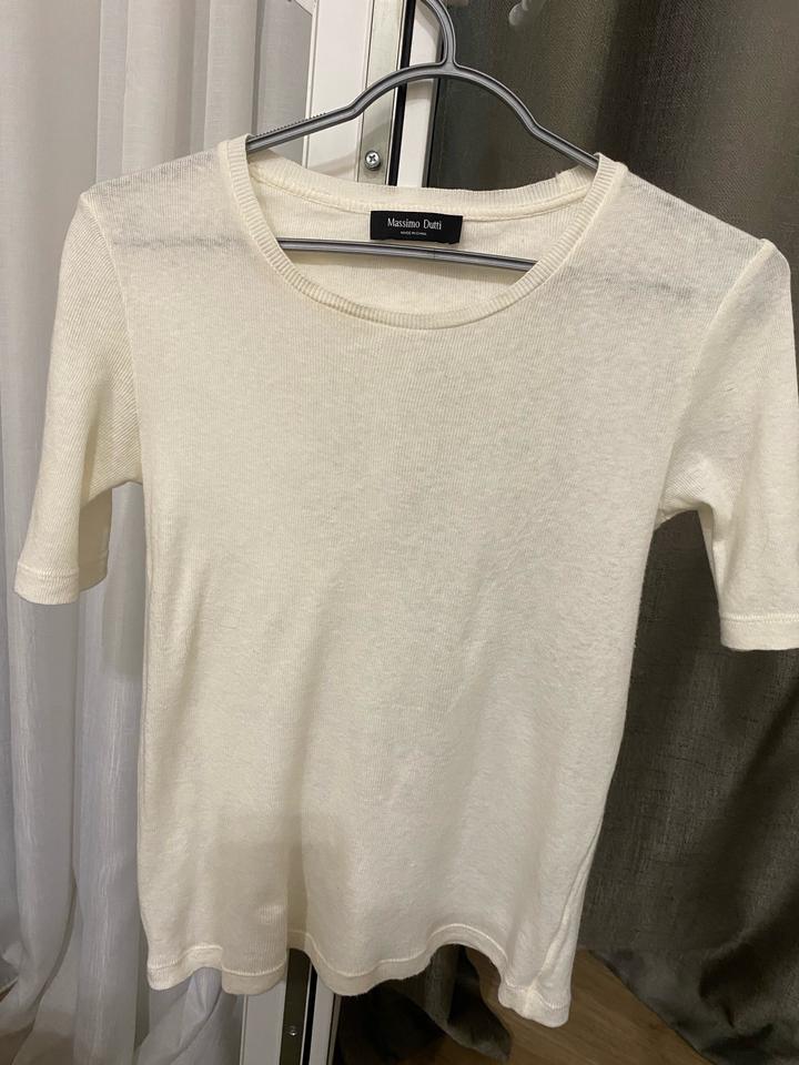 Футболка , трикотажная, бренд Massimo Dutti, бежевый цвет в мелкий рубчик, смотрится стильно, к телу приятная, одевали несколько раз Артикул: 579872