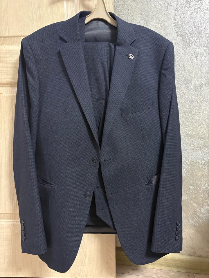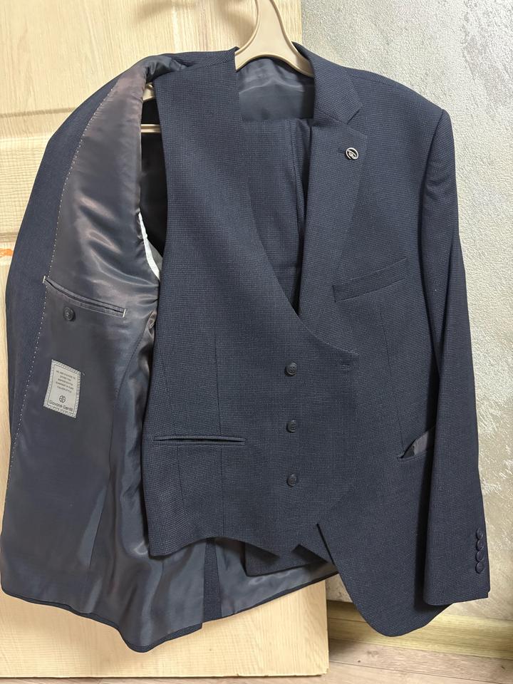 Мужской классический костюм-тройка (пиджак + жилет + брюки) Продается стильный мужской костюм-тройка в отличном состоянии. Цвет — темно-синий. Качественная ткань, аккуратный пошив, смотрится дорого и солидно. Подойдет для свадьбы, торжества, работы, деловых встреч и других мероприятий. ✔ Пиджак ✔ Жилет ✔ Брюки ✔ Отличное состояние ✔ Классический стиль ✔ Качественный материал Размер: 52 Цена: 18 Возможен небольшой торг реальному покупателю. Артикул: 579985