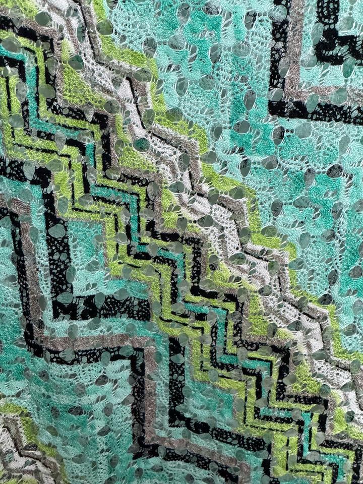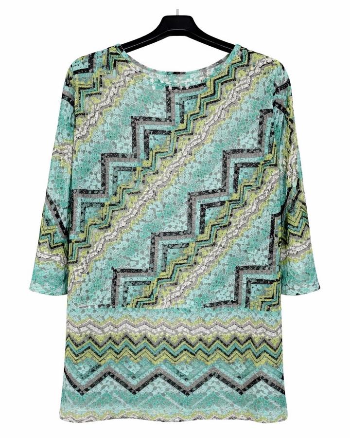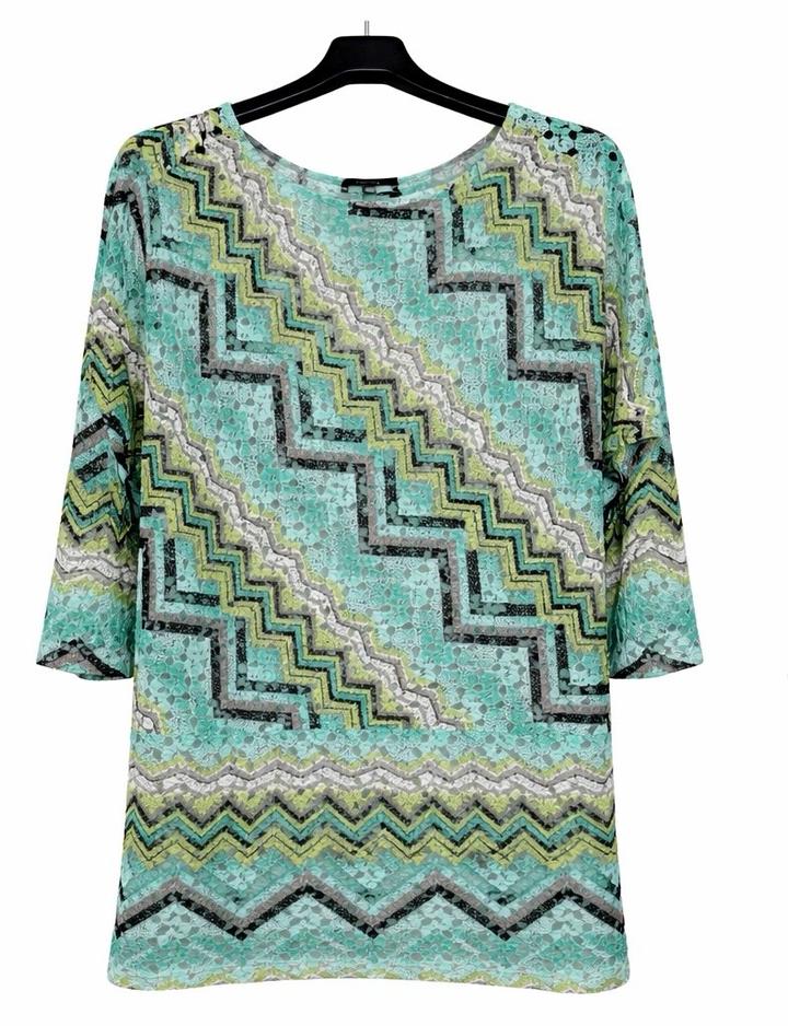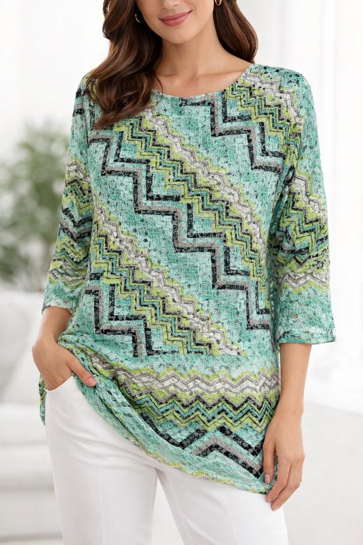 Стильная и очень эффектная блузка немецкого бренда Comma — идеальный вариант для тех, кто любит выглядеть дорого и необычно Особенности: - Красивый ажурный материал (кружевная текстура с легкой прозрачностью) - Освежающий оттенок мяты с графичным узором (черный, белый, лайм) - Эффектный геометрический принт — визуально стройнит - Рукав 3/4 — удобно и элегантно - Свободная посадка — комфортно сидит по фигуре Материал: легкий, дышащий, приятный к телу (смесь синтетики с эластичностью) Артикул: 580082