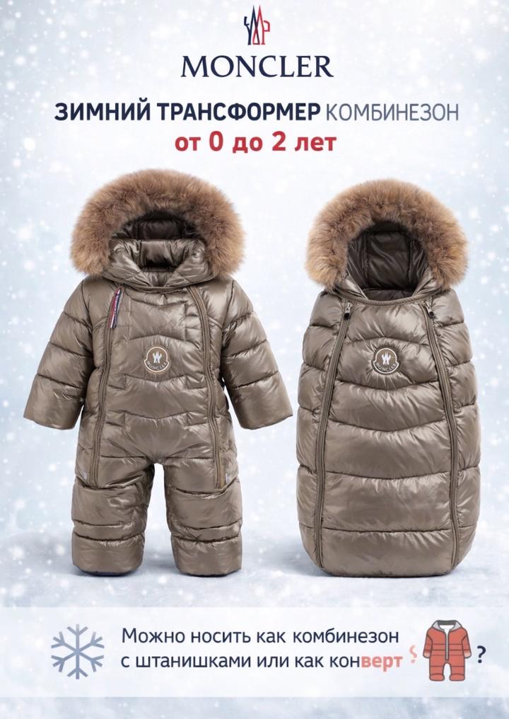 Продам стильный и очень тёплый зимний комбинезон-трансформер от Moncler. Подходит для малышей от рождения до 2 лет. Комбинезон можно носить в двух вариантах: — как полноценный комбинезон со штанинами — как конверт для самых маленьких ✔ Очень тёплый, идеально на зиму ✔ Водоотталкивающий материал ✔ Капюшон с мехом — защищает от ветра ✔ Удобные молнии — легко одевать ребёнка ✔ Мягкий и комфортный внутри ✔ Состояние отличное Подойдёт как для прогулок, так и для коляски. Артикул: 580120