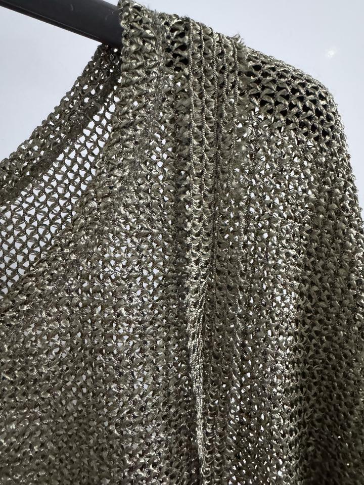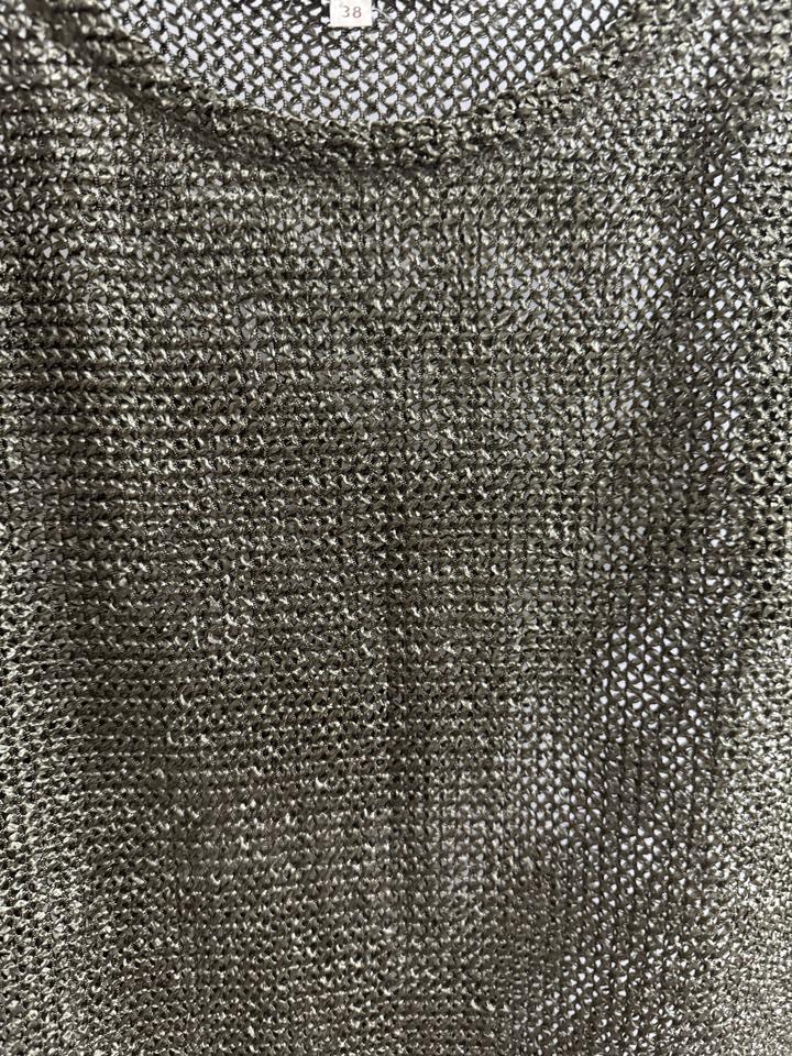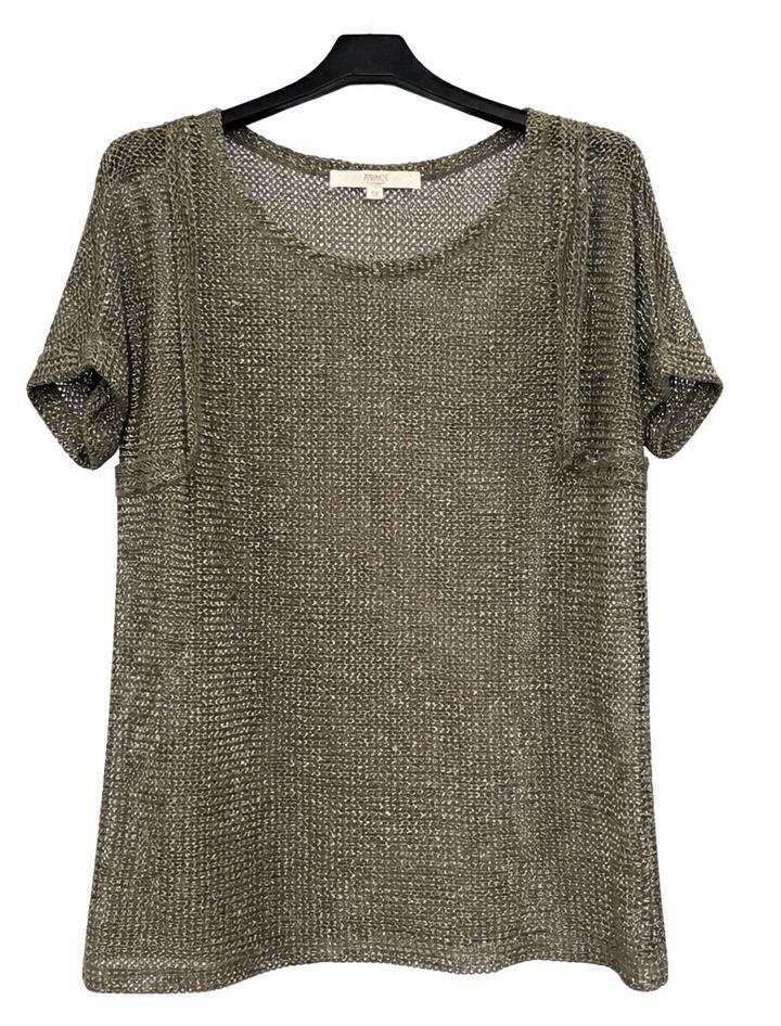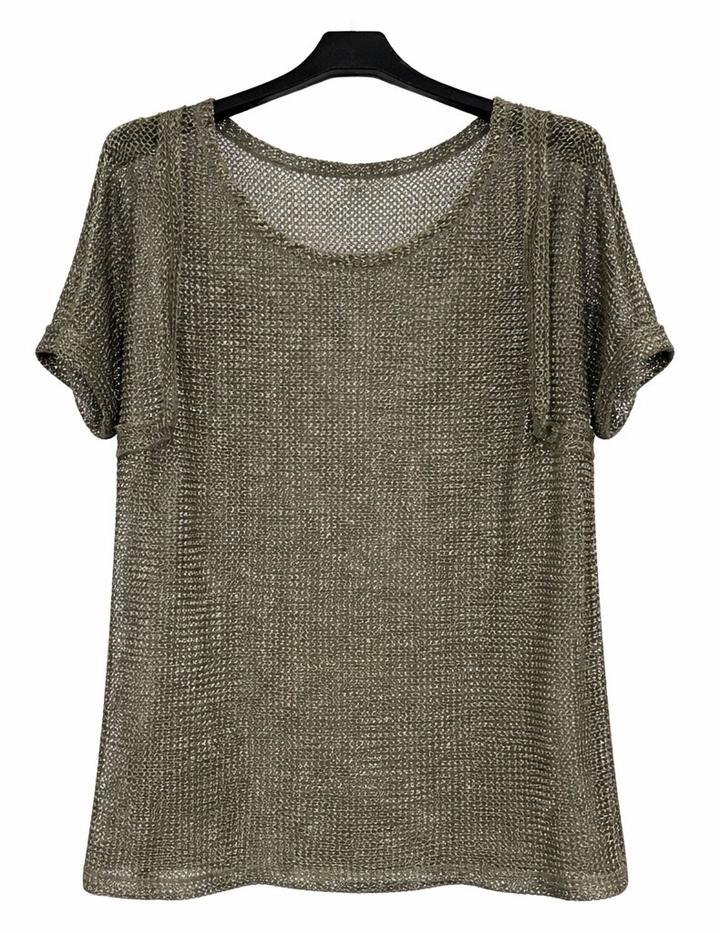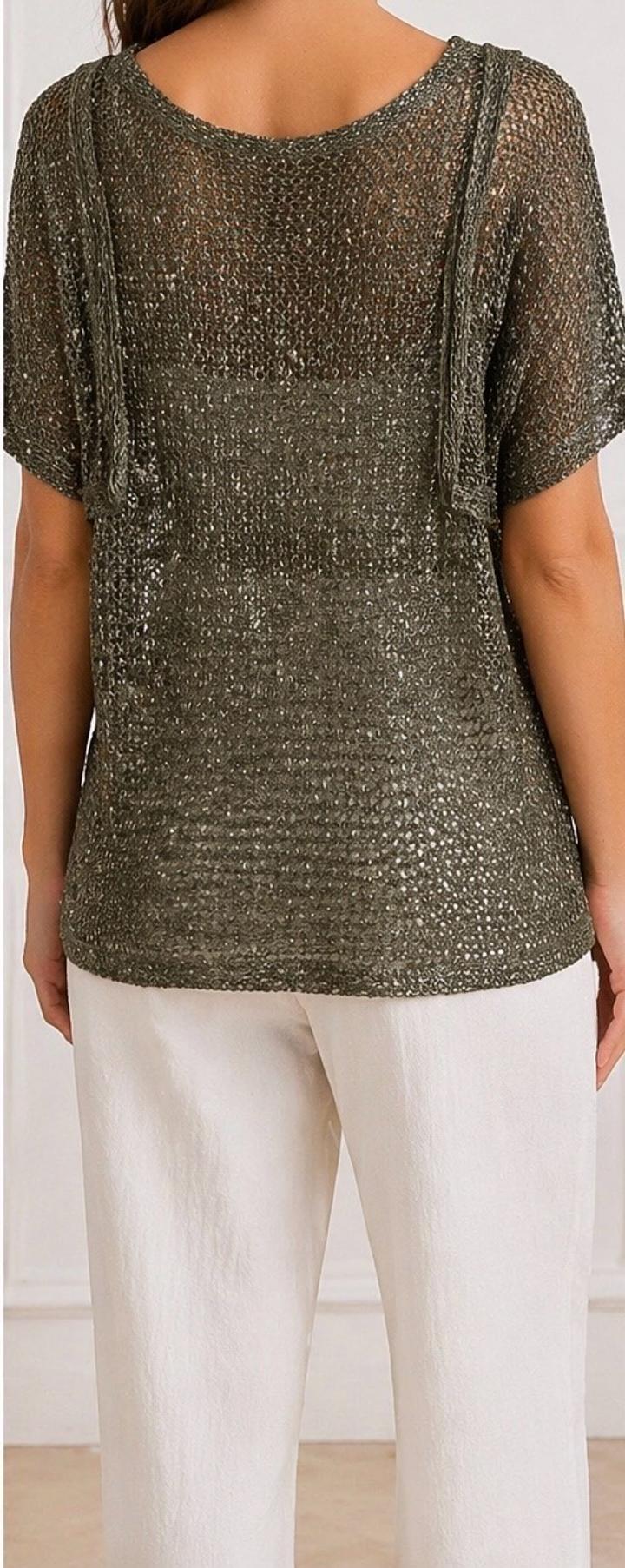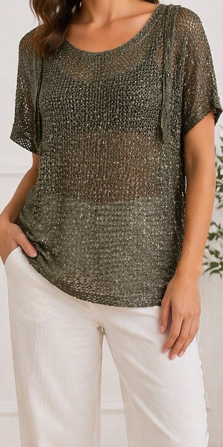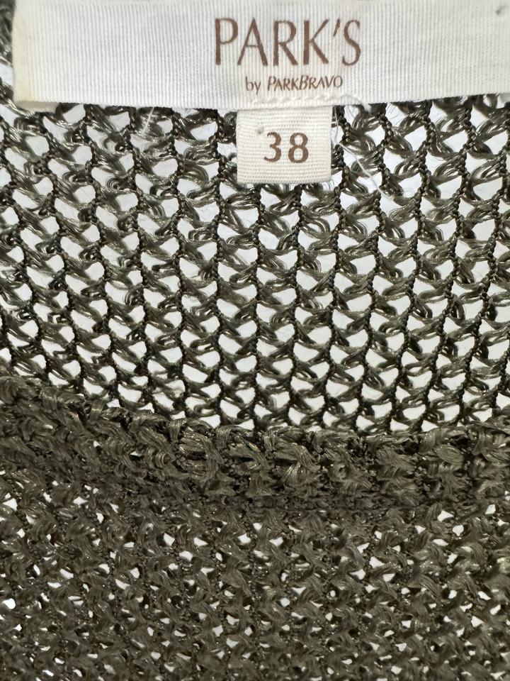 Стильный и эффектный топ в трендовом формате “сеткой” — смотрится дорого и современно Идеально для создания лёгких, модных образов. Особенности: - Итальянский бренд Park’s by Park Bravo - Ажурная вязка с красивым металлическим переливом - Цвет: благородный оливково-серебристый - Свободный крой — скрывает нюансы фигуры - Короткий рукав, комфортная посадка - Лёгкий, дышащий материал Лёгкий, с красивым переливом. Артикул: 580146