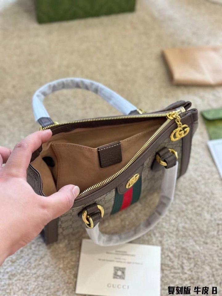 Материал: Изготовлена из прочного фактурного канваса GG Supreme бежевого и темно-коричневого цветов с отделкой из натуральной зернистой кожи. Дизайн: Декорирована культовой красно-зеленой лентой Web и золотистой металлической фурнитурой в виде логотипа Double G. Особенности: Имеет две закругленные ручки и съемный плечевой ремень, что позволяет носить её как в руках, так и на плече или через плечо (crossbody). Размеры: Примерные габариты модели составляют около 24–25 см в ширину, 20 см в высоту. Артикул: 580185