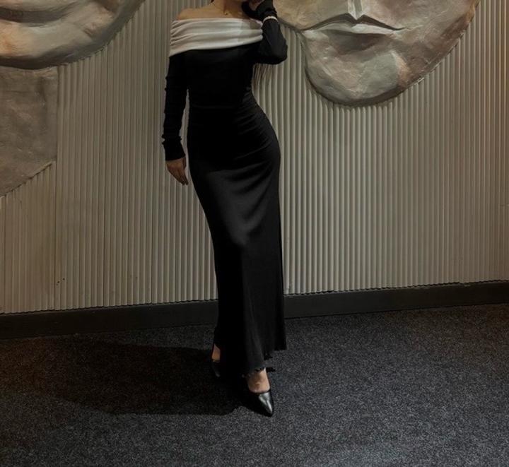 Длина: макси (до щиколоток) * Верх: открытые плечи (off-shoulder) с широким белым отворотом — создаёт акцент на зоне декольте и плечах * Рукава: длинные, узкие Артикул: 581022